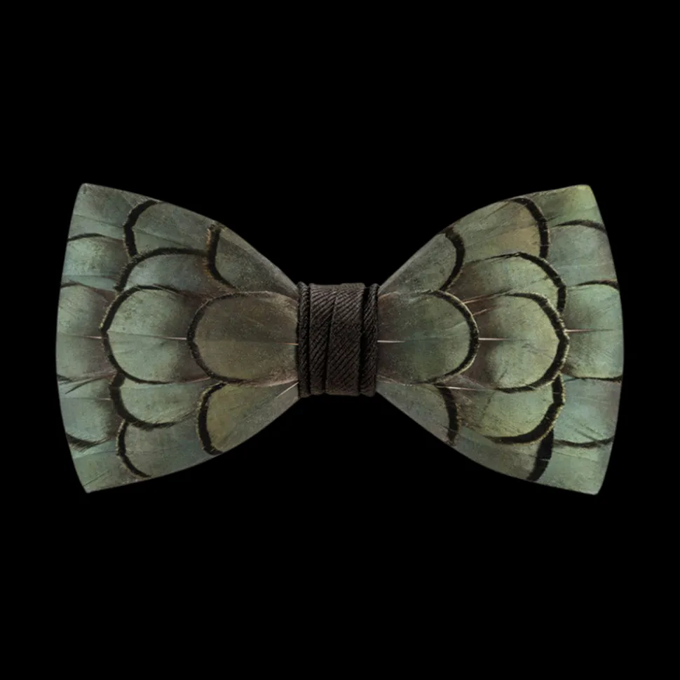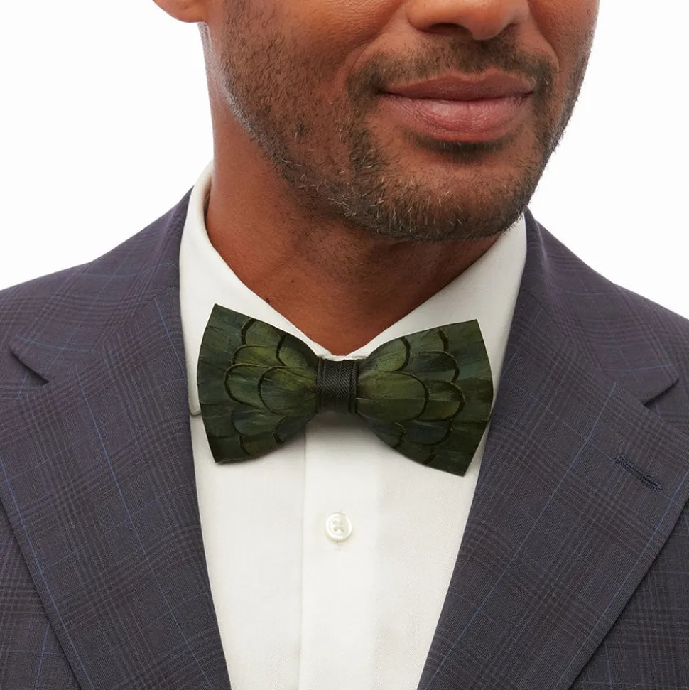 Brackish began with one feather bow tie designed by Ben Ross and gifted to his groomsman, Jeff Plotner. Since its inception, the brand has blossomed into a full line of men’s and women’s accessories designed and handcrafted in Charleston, South Carolina with each piece focused on honoring the beauty found in nature. A tribute to Owen Jeffrey, a legendary sportsman and mentor, the Jeffrey Bow Tie was inspired by his archery and bow making. This piece features hues of rich, emerald green and is made with pheasant feathers.