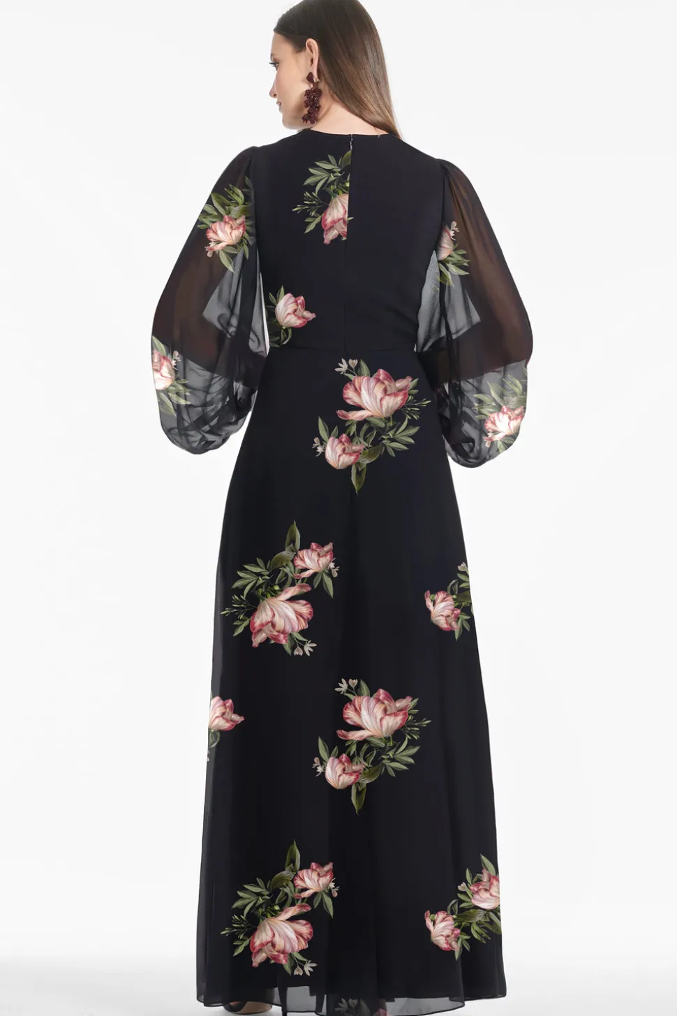 Born in India, Sachin and Babi bonded at New York’s Fashion Institute of Technology and launched an embroidery business, working with top houses, like Oscar de la Renta, and Manolo Blahnik. Today, the brand works with their own factory in Mumbai, controlling quality at every stage, and producing womenswear that is at once unique, beautiful, and wearable. Elegant and understated, the Jenny Gown in Noir Blossom is crafted in satin crepe, and boasts an empire waist that falls to a flattering A-line skirt. We love the collapsed crescent sleeves a subtly stunning finishing touch.