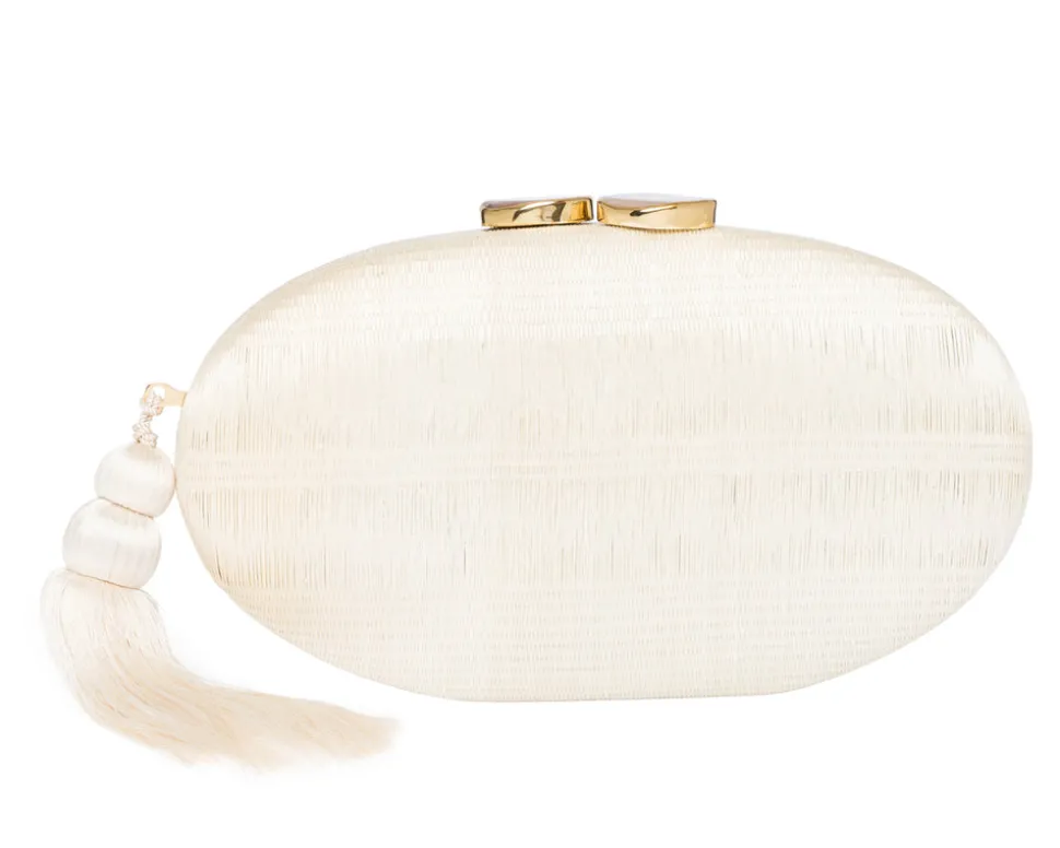 Rafe Totengco finds inspiration in architectural forms the world over for his exquisite minaudières and clutches. Born in the Philippines and based in New York city, Totengco weaves multi-cultural references into his carefully detailed accessories, which impart not only a sense of everyday glamour, but that of objects d’art. Crafted in handwoven buntal straw (a natural palm leaf), the Joanna Clutch in Natural & Ivory is designed in a feminine, oval silhouette, with a taupe agate stone closure stone closure, set in brass, and an elegant, tonal tassel. We love it for a fun evening out.