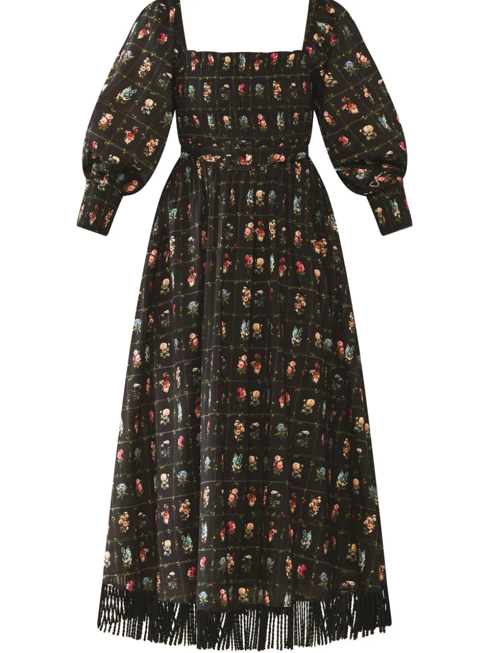 100% BCI cotton twill. Vintage floral grid print. Fringe-trimmed hem. Smocked bodice. Square neckline. Billowed sleeves with gathered cuffs. Adjustable belt at waist. Made in India.