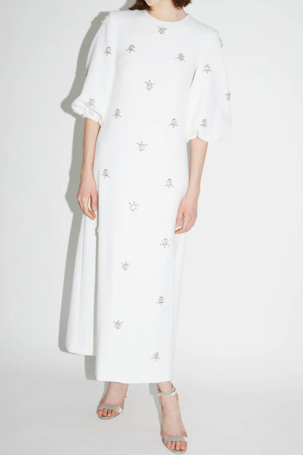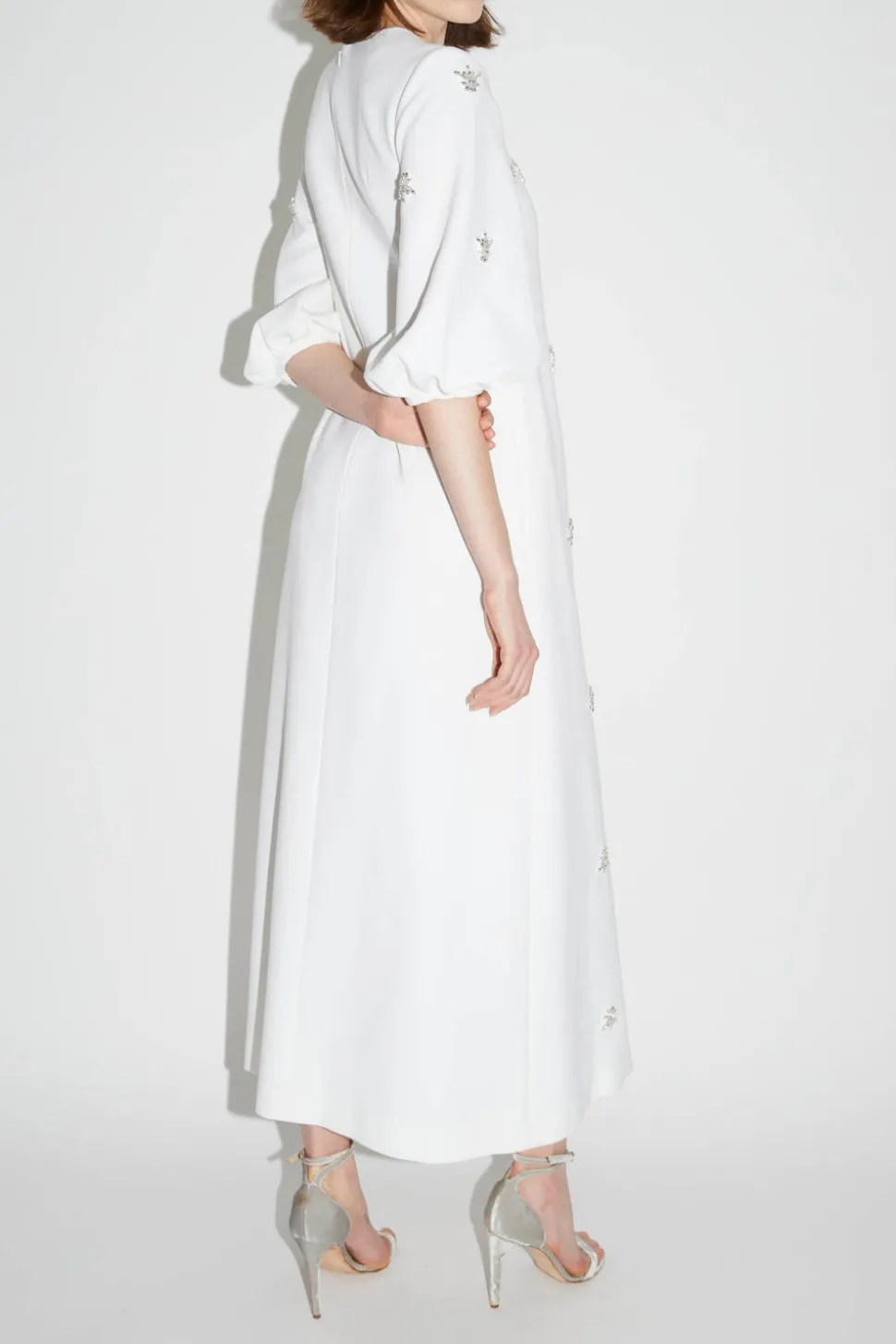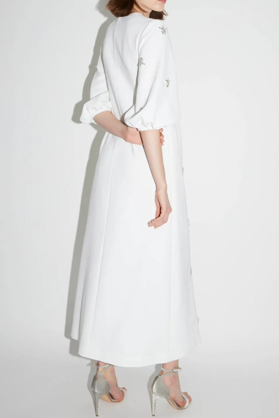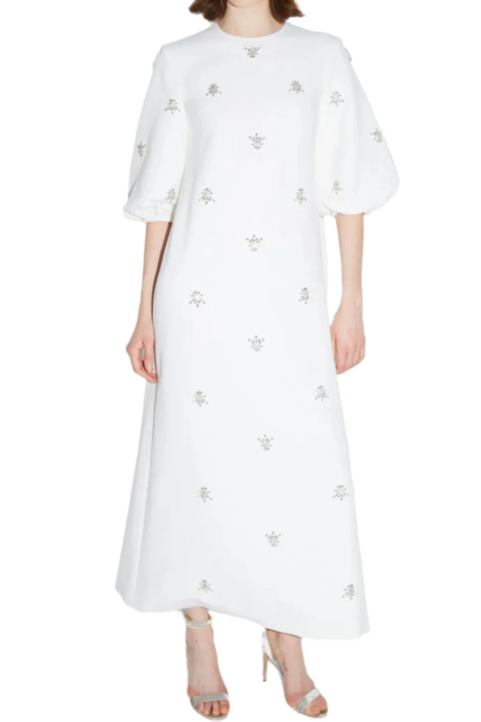 The London-based luxury brand, Huishan Zhang, was launched in 2011. As a Chinese-born designer, Huishan combines his heritage with Western influences to create a sophisticated, signature style. The Joelle Dress in Pure White Embellished Crepe is made from recycled stretch crepe in a loose fitting silhouette. The Joelle is hand-embellished with baroque style crystals throughout the front and on the sculpted cocoon sleeves. Features a modest round neck also adorned with crystals, and a concealed zip through centre back.