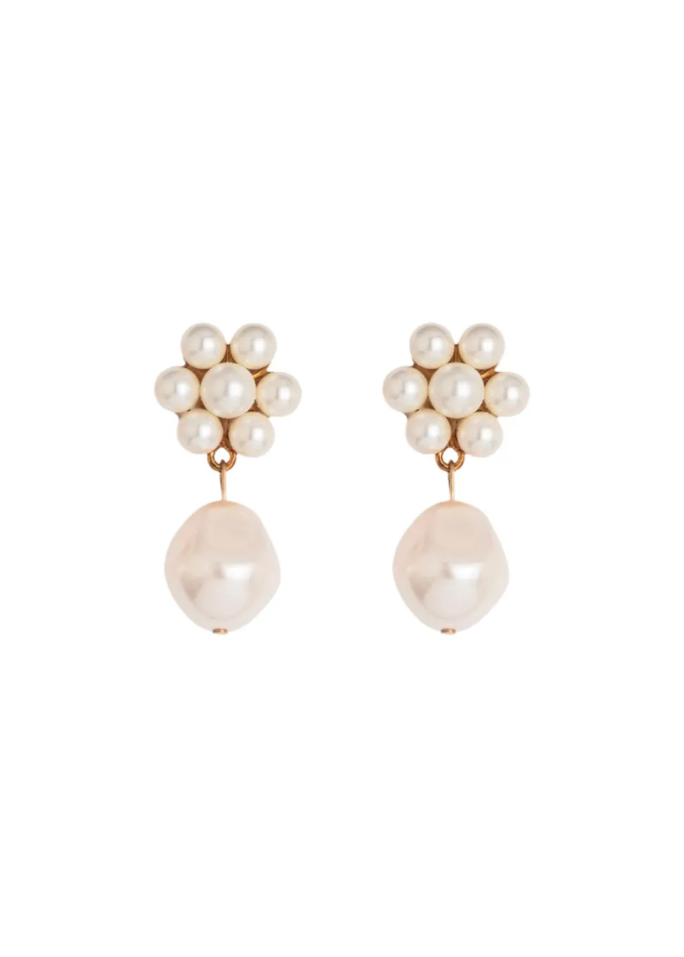 Surgical-steel post. Nickel-free and safe for sensitive skin. 18K gold plated brass and set with hand glued Czech glass pearls and poly baroque pearl drops. Handmade in New York.