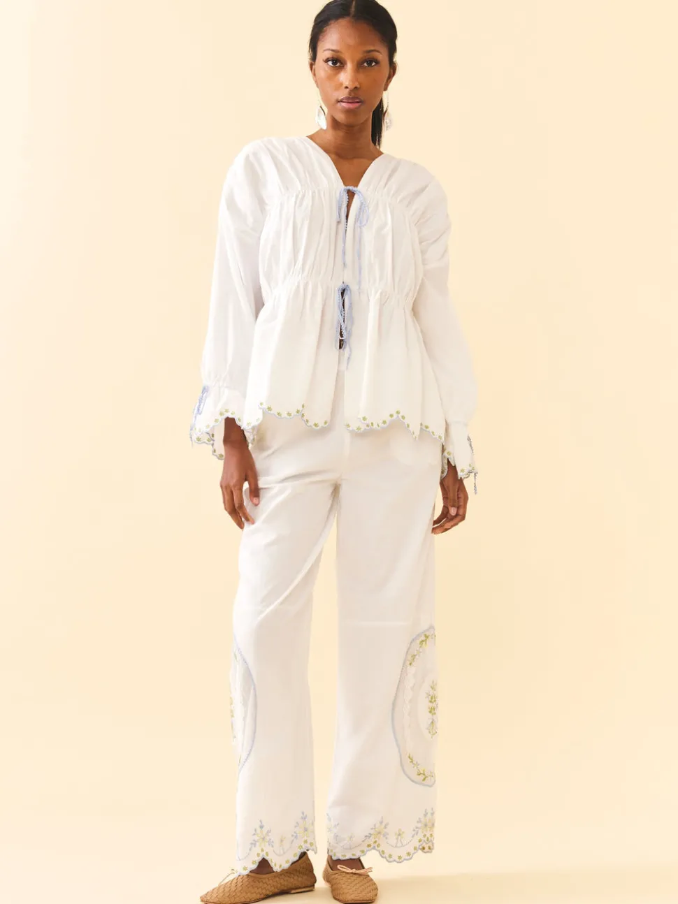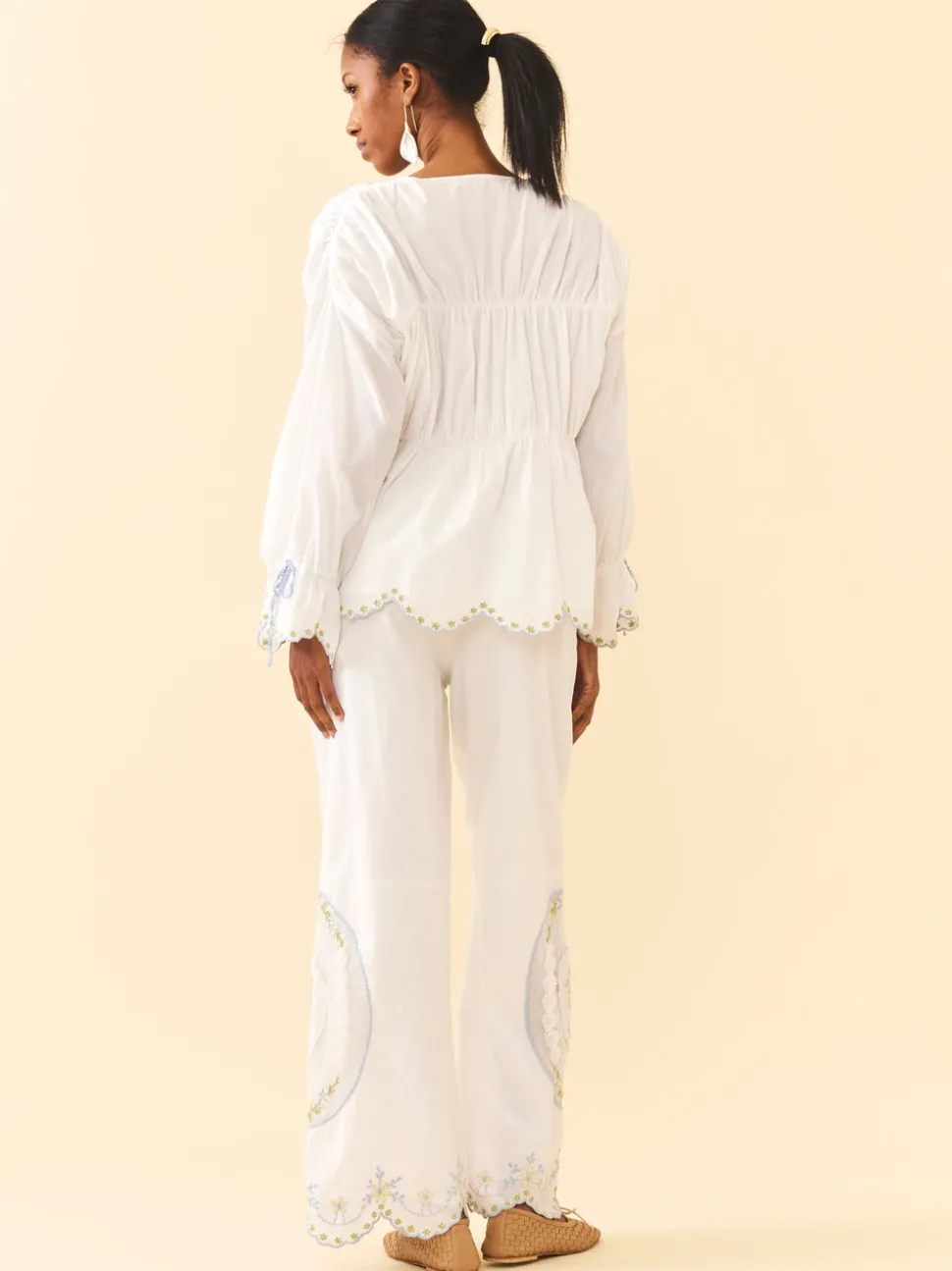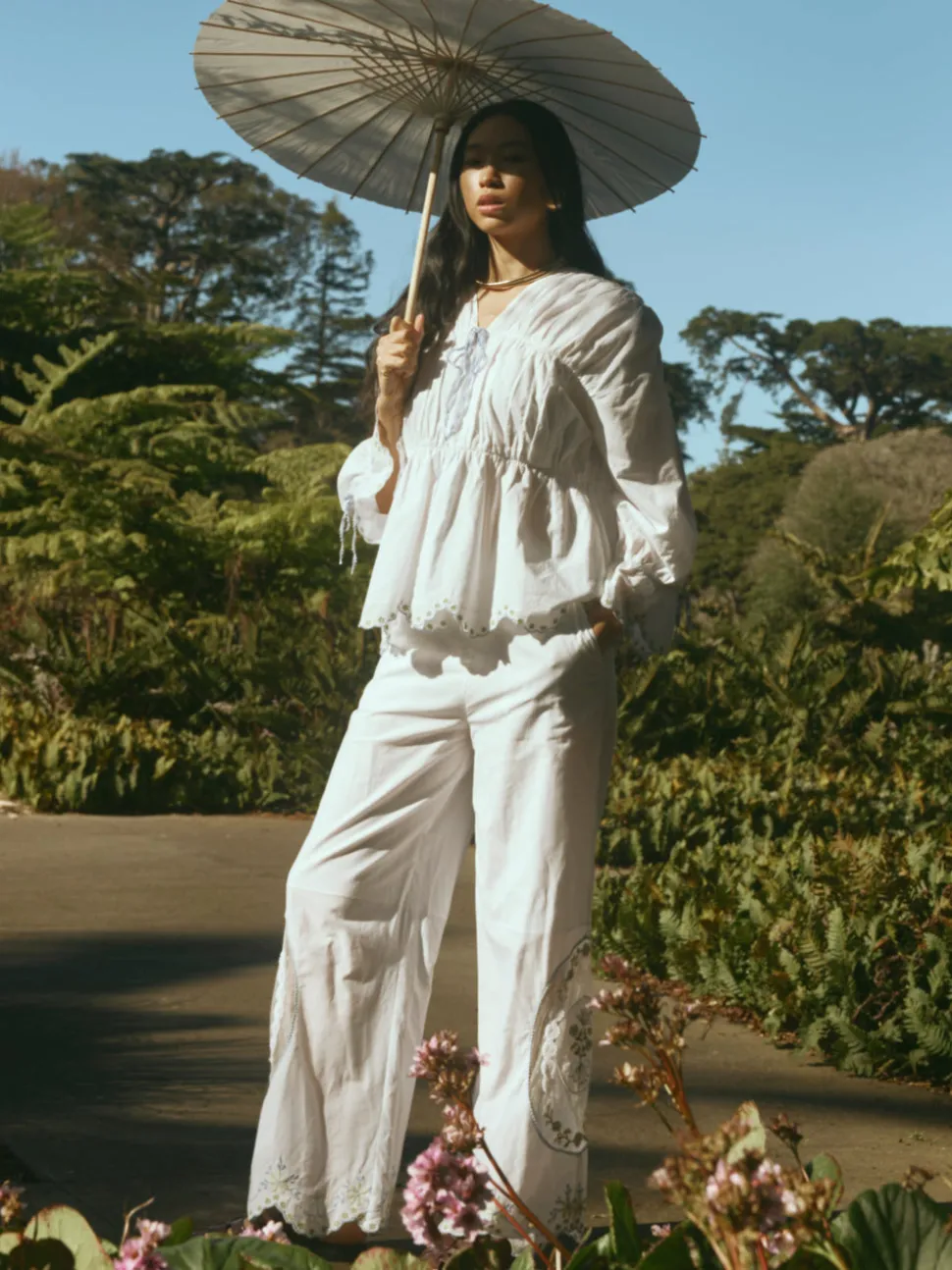 Tomboy looks, girly-girl styles, and an always fashionable approach define Eddy’s aesthetic. With a focus on bold and feminine silhouettes, Eddy dresses and tops pair elevated California bohemian with global inspiration; these are clothes designed to make you feel good inside and out. Easy, breezy, and beautifully detailed, the Juliana Pants in White Whimsy are made from lightweight cotton with sheer lace mesh panels and delicate embroidery throughout. The wide-leg fit gives it a relaxed, flowy feel, while scalloped hems and a vintage-style medallion add a romantic touch. Pair it with the matching top or throw on a simple tank.