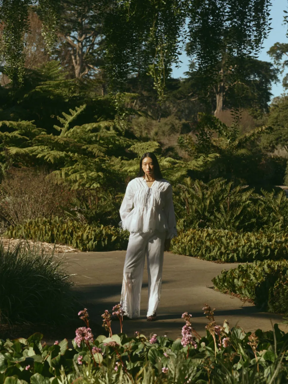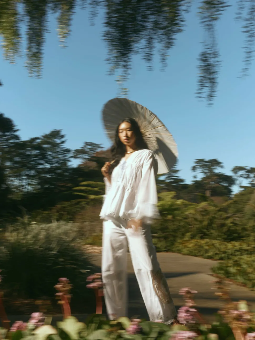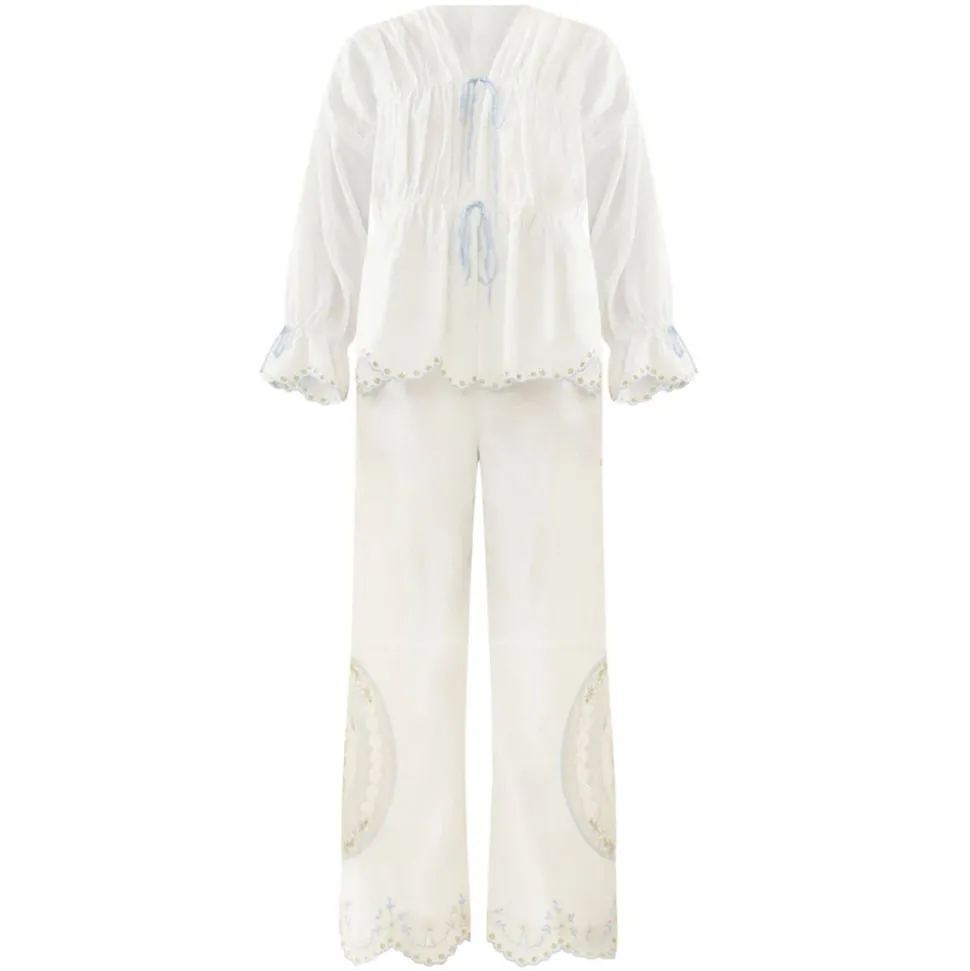 Tomboy looks, girly-girl styles, and an always fashionable approach define Eddy’s aesthetic. With a focus on bold and feminine silhouettes, Eddy dresses and tops pair elevated California bohemian with global inspiration; these are clothes designed to make you feel good inside and out. Easy, breezy, and beautifully detailed, the Juliana Pants in White Whimsy are made from lightweight cotton with sheer lace mesh panels and delicate embroidery throughout. The wide-leg fit gives it a relaxed, flowy feel, while scalloped hems and a vintage-style medallion add a romantic touch. Pair it with the matching top or throw on a simple tank.