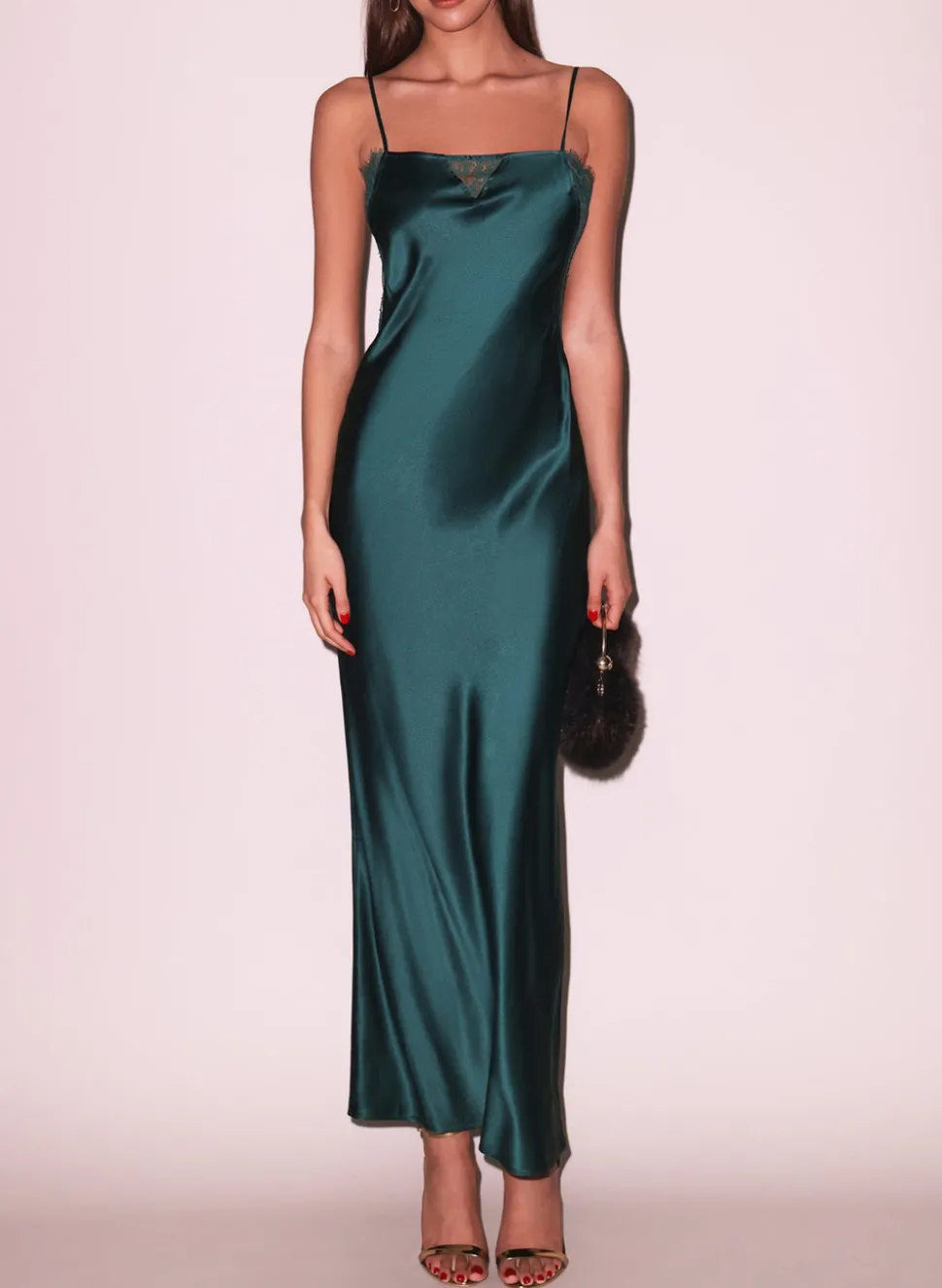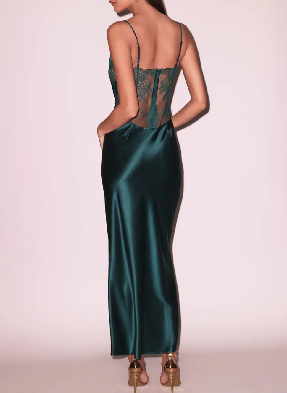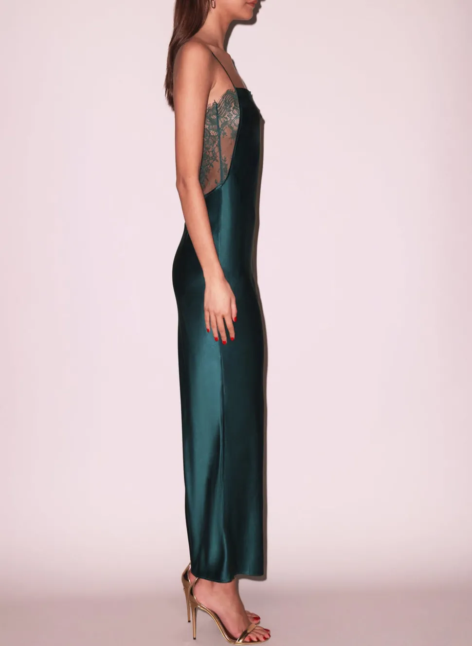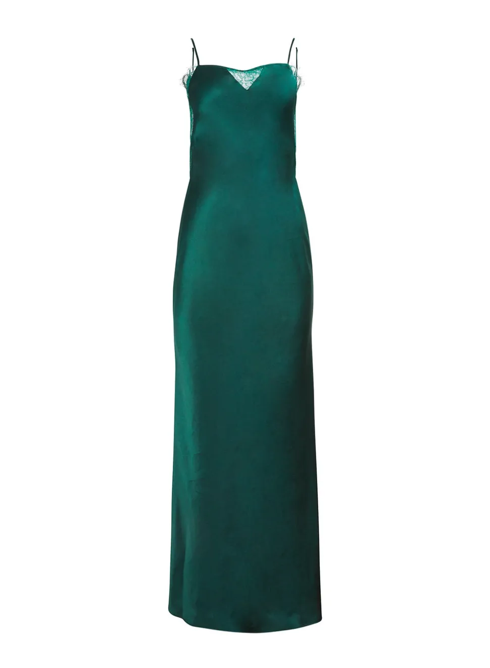 Inspired by Charles Baudelaire’s masterful collection of poetry entitled “Les Fleurs du Mal,” Jennifer Zuccarini founded Fleur du Mal with the belief that wearing beautiful lingerie should be an everyday affair. Tastefully provocative, the luxury brand has amassed a cult following of devotees who adore the sultry and empowering pieces. The Juliet Lace Back Dress is cut from luxe silk charmeuse that hugs every curve. Features adjustable straps and back zip closure, with lace back panel for an extra dose of skin. Hits at the ankle. Take if from bar to bedroom with your favorite Essentials panty.