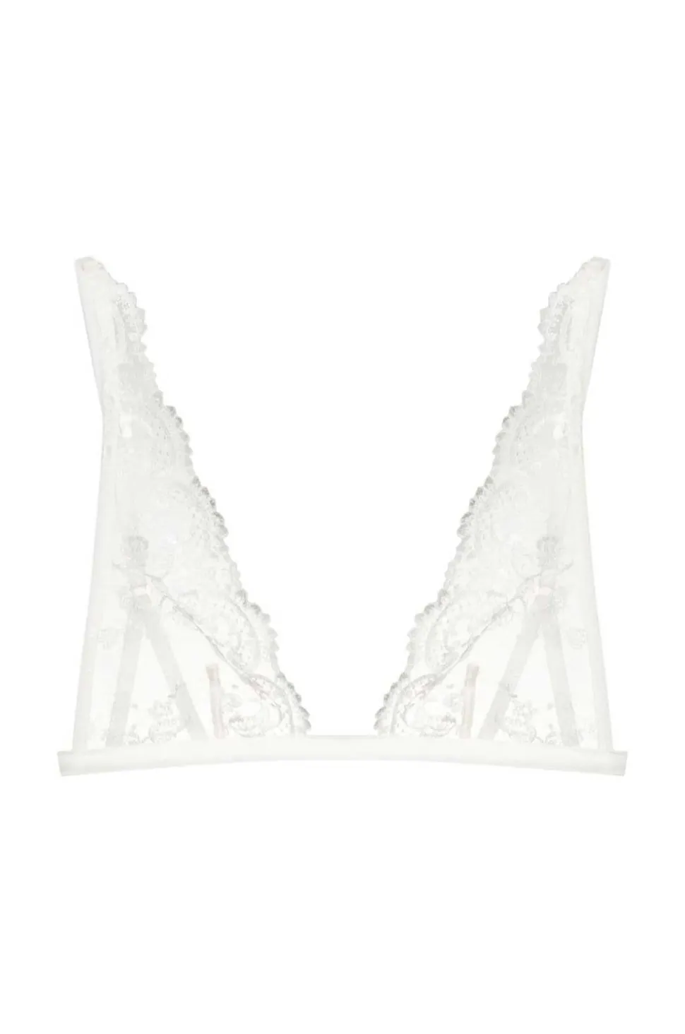 Based in New York, Kiki de Montparnasse is a lingerie, accessory, and ready-to-wear brand for those seeking a refined perspective on sensuality and seduction. These luxury collections are designed to be coveted, experienced, and enjoyed. Exquisite and embroidered in tulle, the Juliette Soft Bra in Ivory is undeniably romantic. This stunning piece has a touch-it, feel-it element to it. Pair it with the Juliette Thong.