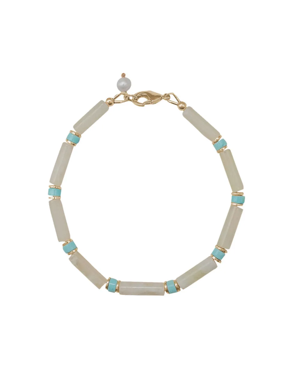 Green jade and turquoise gemstones, freshwater pearl. Gold-filled lobster clasp closure. Handmade in Newport, Rhode Island. Due to the unique nature of genuine stones and freshwater pearls there will be slight variations from images on site.