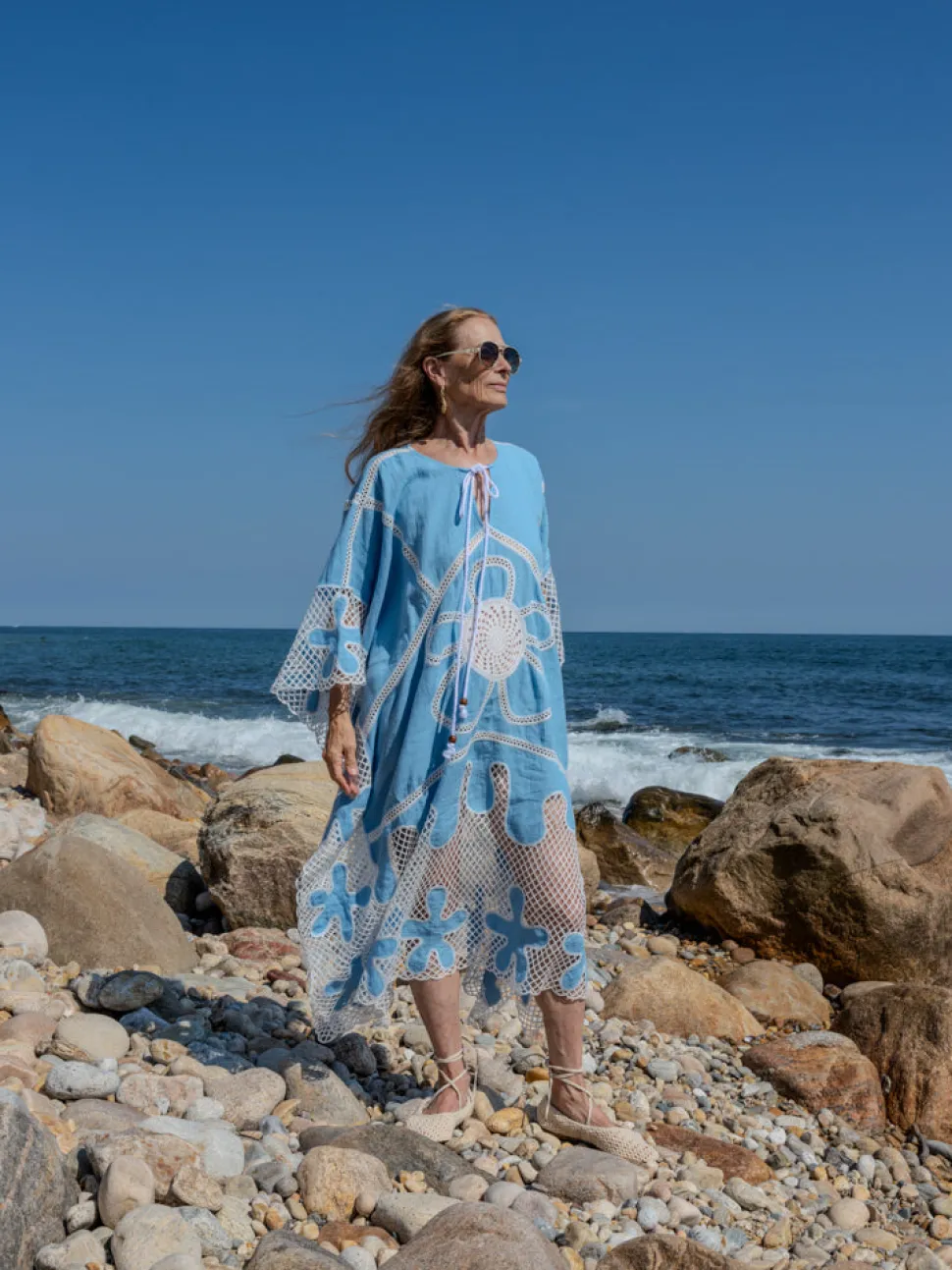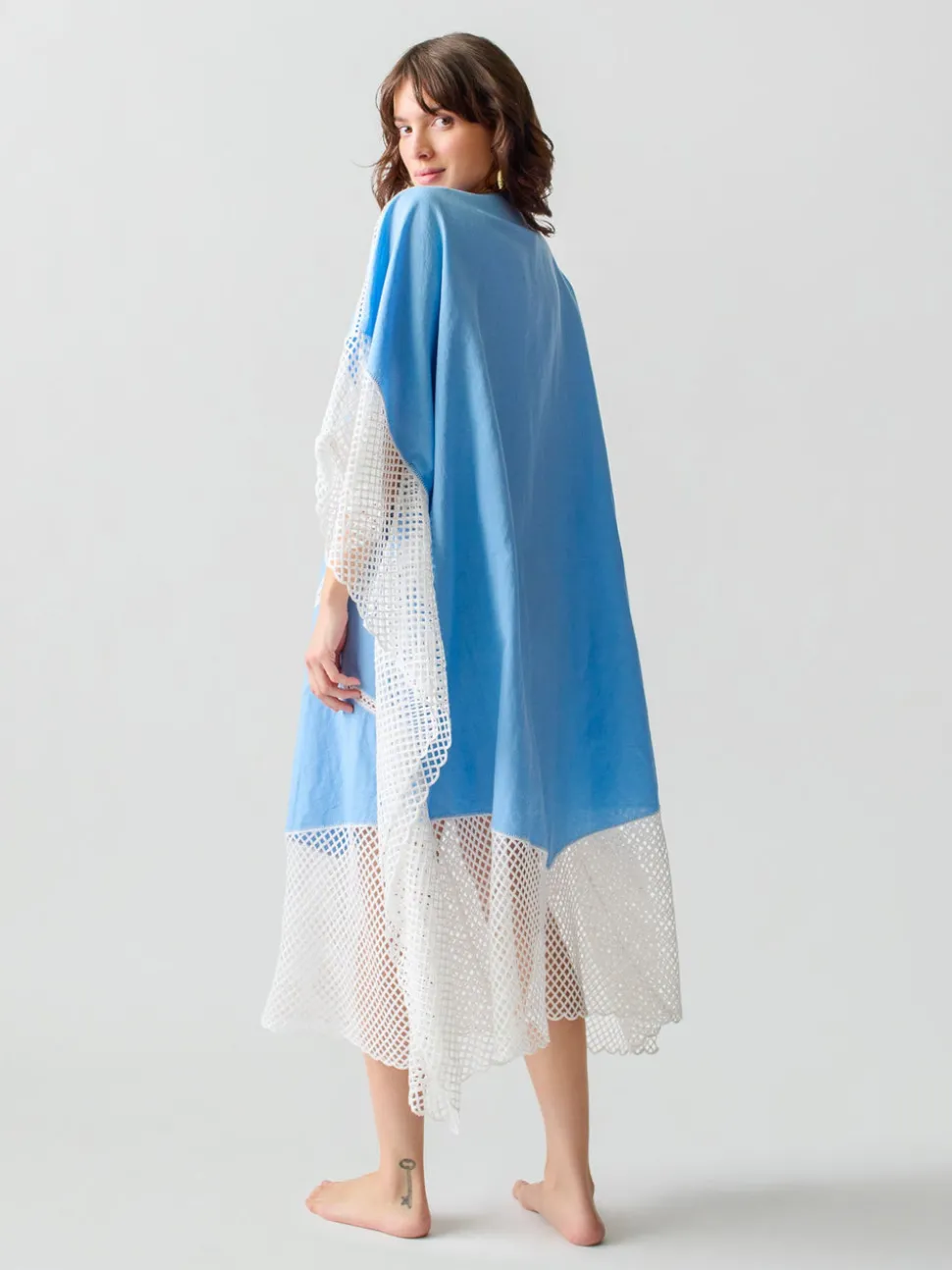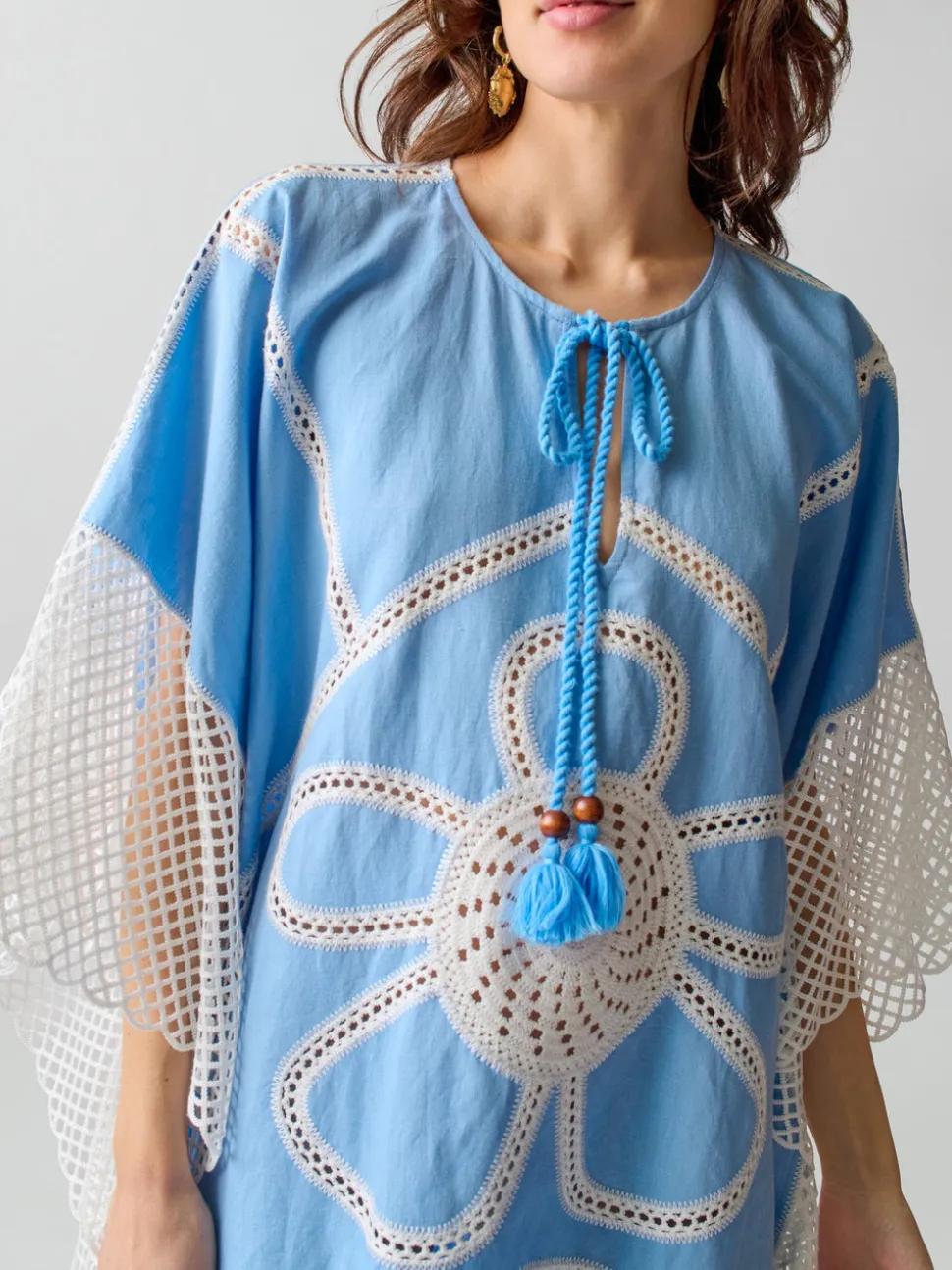 Lingua Franca is a line of sustainably-sourced, fair trade luxury ready-to-wear and cashmere pieces, all hand-stitched by women in New York City. Every word on Lingua Franca’s staple pullover sweaters is chalked in script by designer Rachelle Hruska MacPherson before it is ever stitched. The Kampos Caftan in Blue Multi is named after the popular hangout beach in Patmos. Made from a linen and cotton blend, this piece features flower motif embroidered crochet throughout it, and rope ties at the neckline with wooden bead details. Pair with the Kampos Halter Top or Kampos Halter Top.