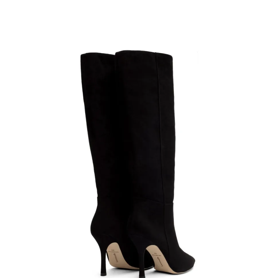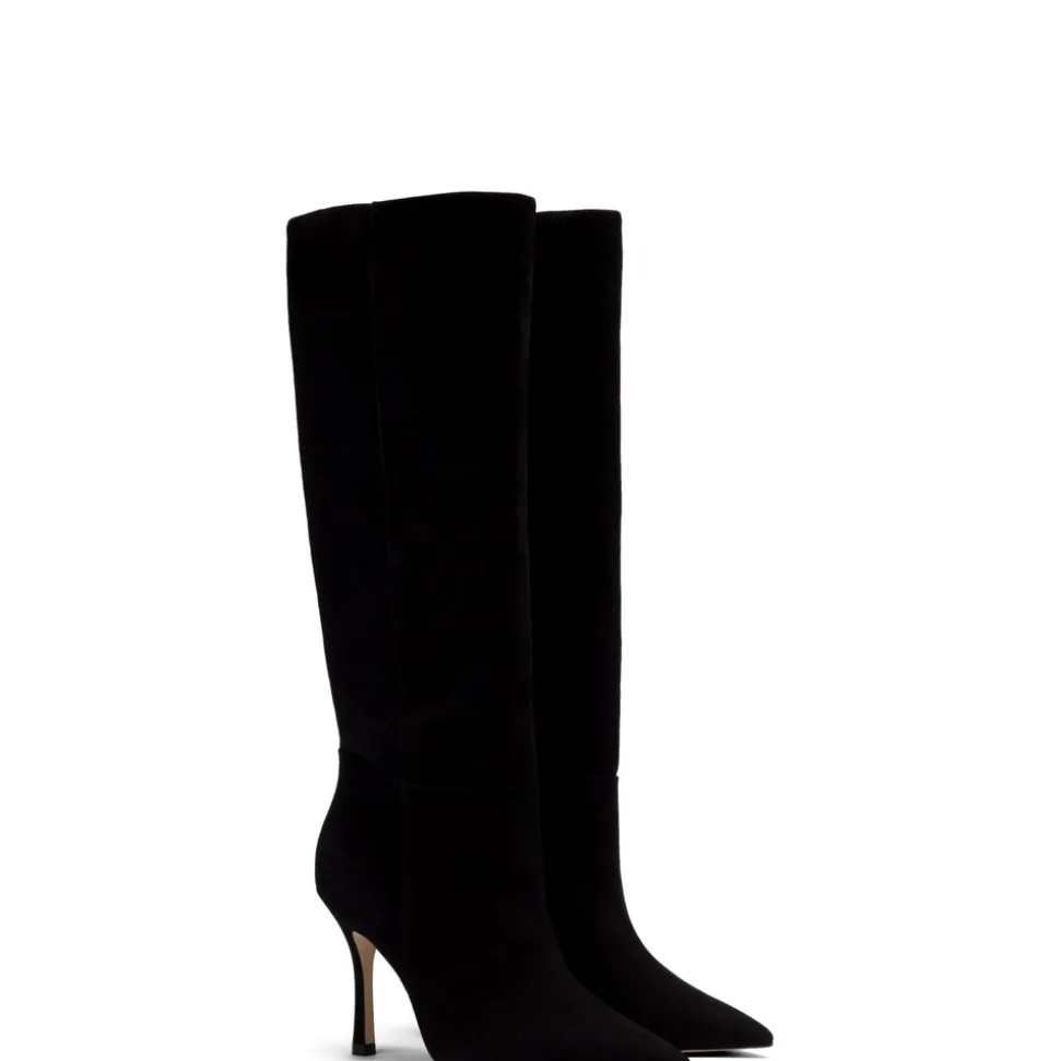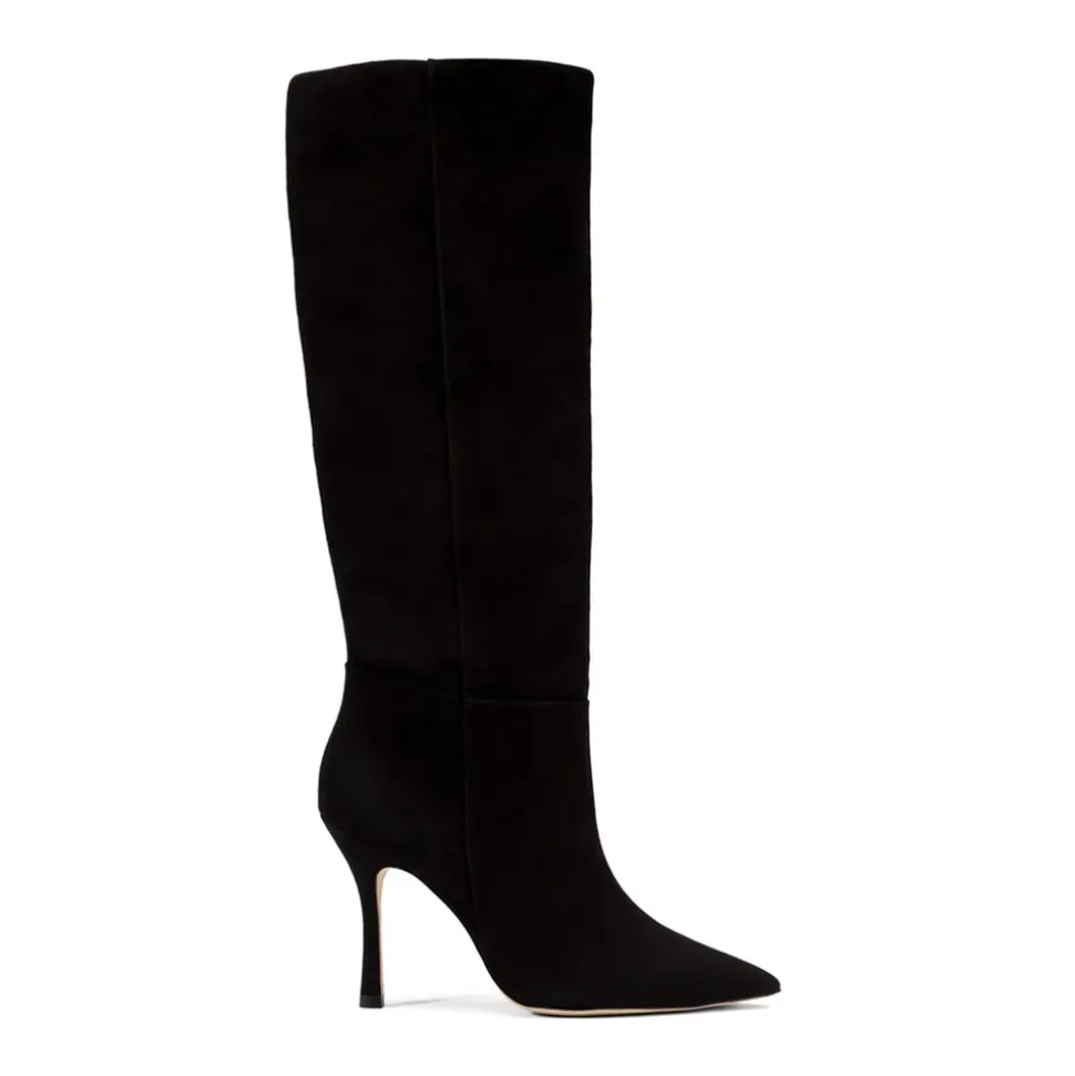 Kid suede leather. Closed pointed toe. Pull up boot. 3.8-inch stiletto heel. Finely crafted leather sole for support, durability, and comfort. Insole with memory foam cushion and hot stamp logo.