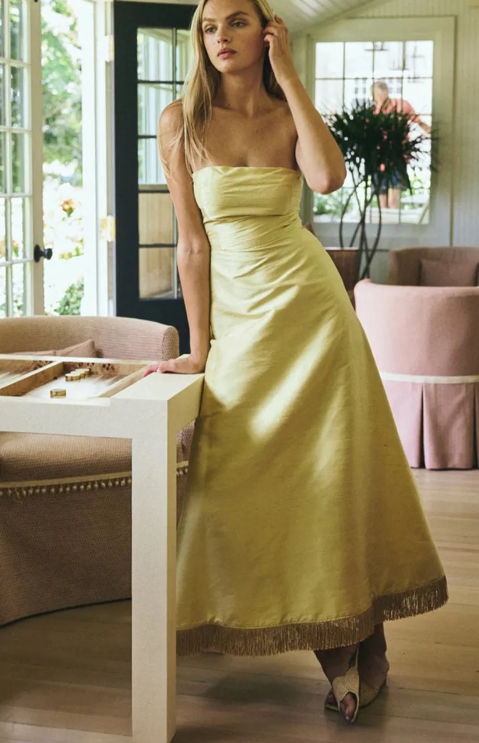 Louise New York creates its collection with the past and present in mind. Inspired by timeless glamour instead of trends, when you slip into a Louise New York dress, you carry all the confidence and carefree attitude that femininity can acclaim. This strapless silk dress is both playful and refined. Crafted from silk dupioni in a striking lemon hue, the Katherine Dress in Lemon Yellow features a sculpted bodice and a full A-line skirt finished with bold fringe trim. Ideal for weddings, cocktail parties, or any occasion that calls for something special.