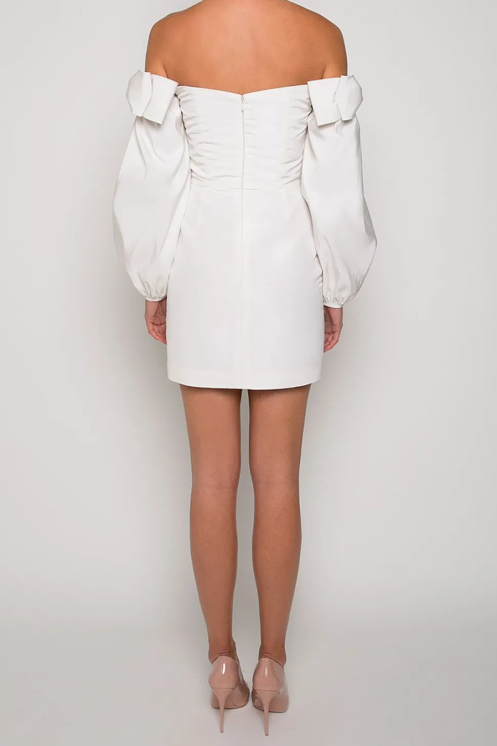 100% silk shell and 100% polyester lining. Off-the-shoulder. Balloon sleeves. Boned bodice. Concealed back zipper with hook-and-eye closure. Made in the USA.