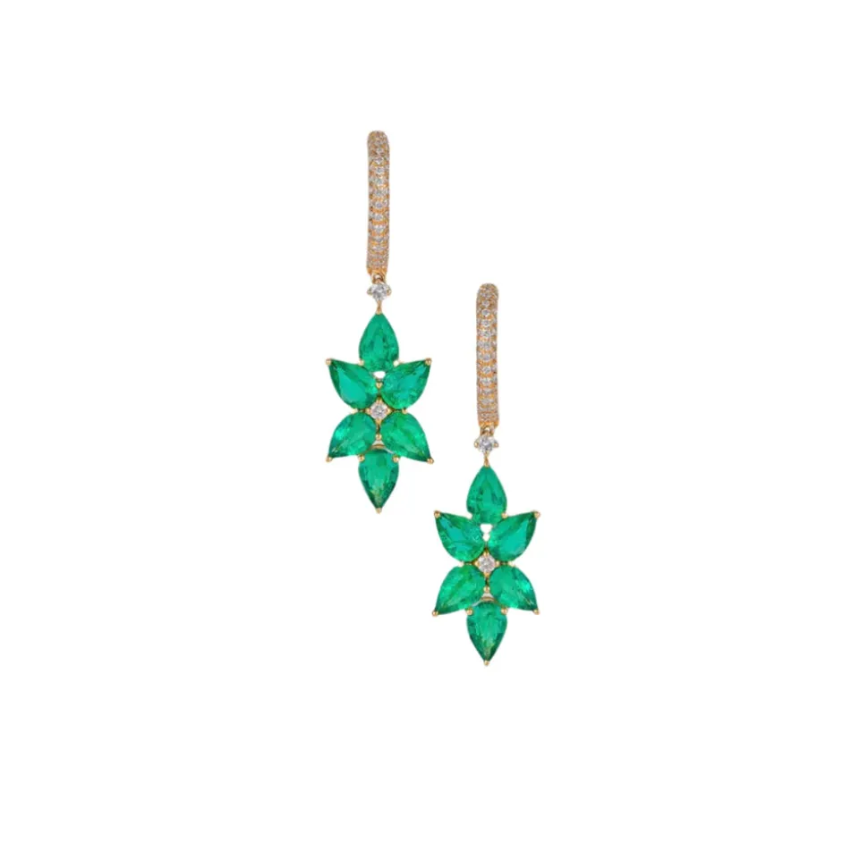 Each piece of jewelry from Sanjay Kasliwal is handcrafted at its atelier in Jaipur by master artisans, many of whom have been with the company for generations. Made from the highest quality of materials and with ethically sourced stones that are hand-cut and polished directly in the workshop, this jewelry supports eight generations of passion and craft intended to be passed down for years to come. Flowers formed by shining emeralds with diamond centers hang from golden bands encrusted with diamonds in the Kavya Emerald and Diamond Earrings.
