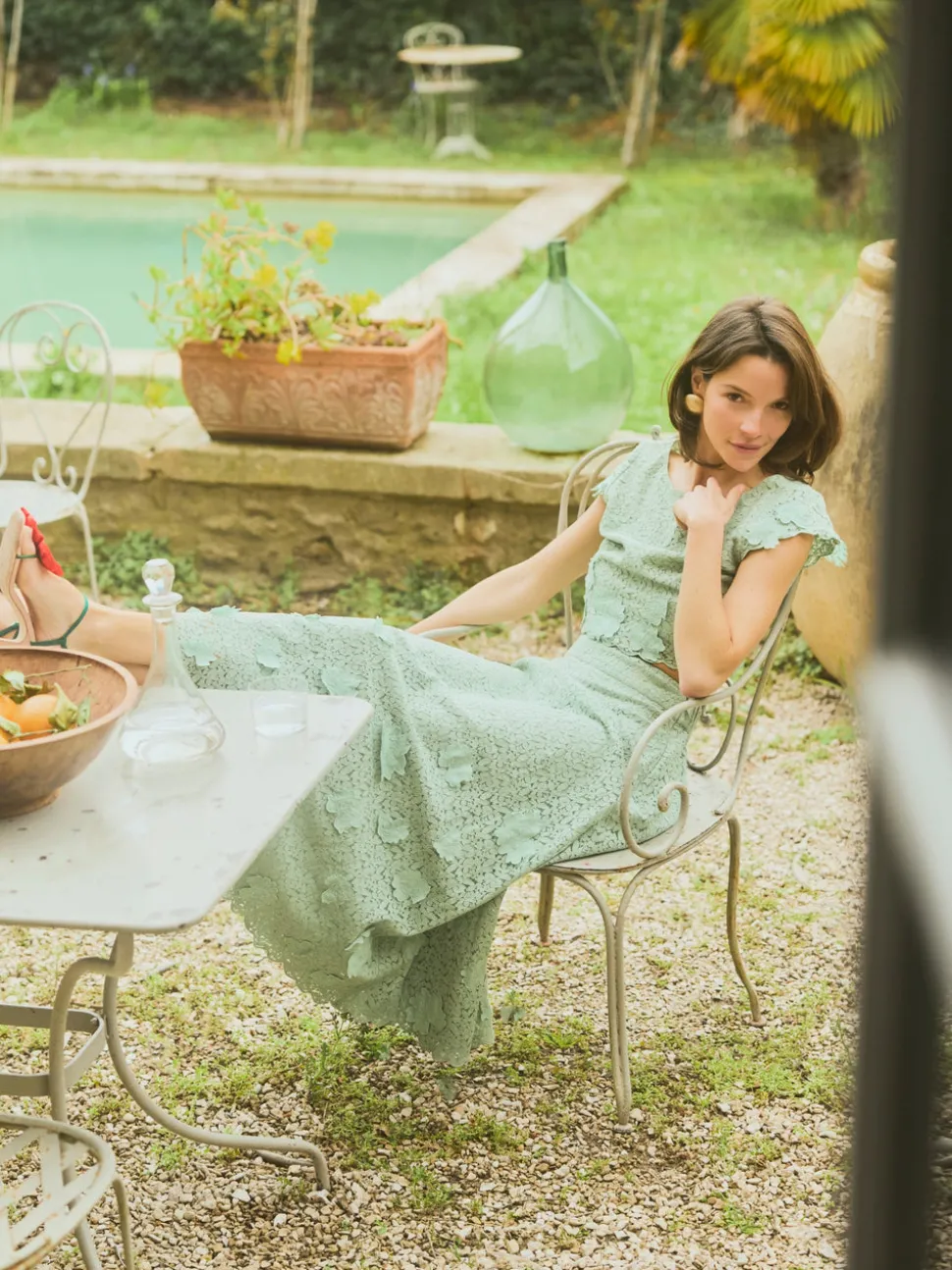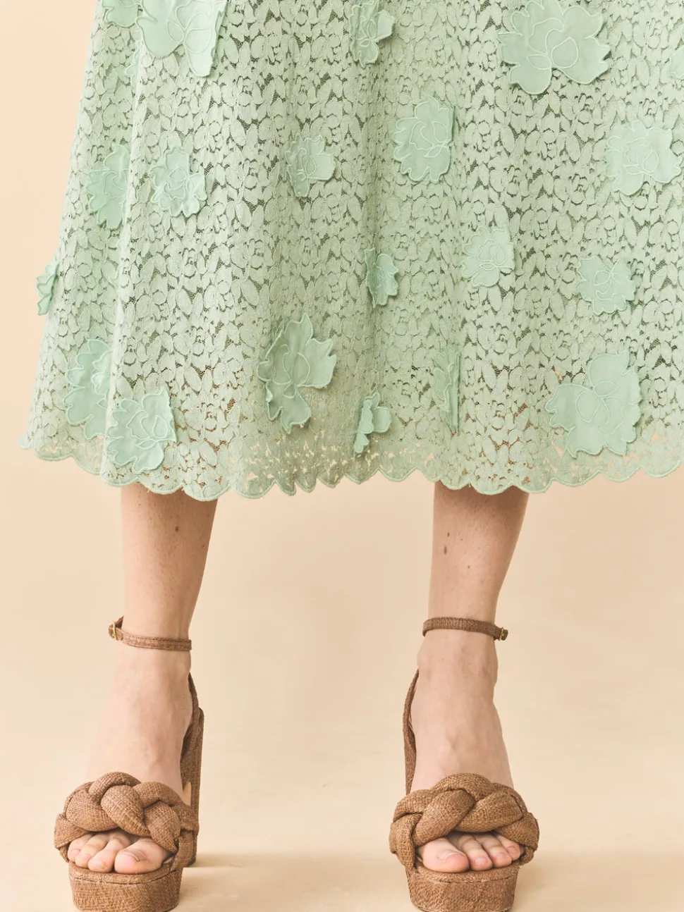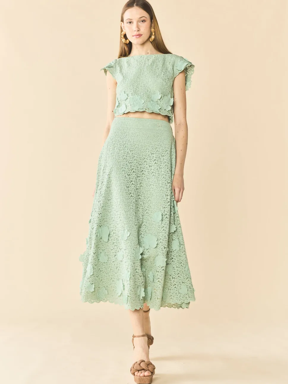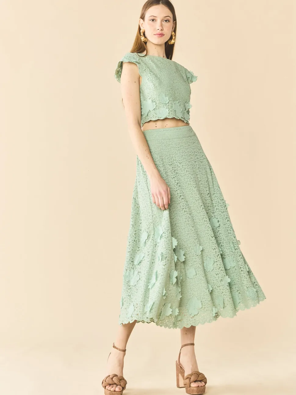 Tomboy looks, girly-girl styles, and an always fashionable approach define EDDY’s aesthetic. With a focus on bold and feminine silhouettes, EDDY dresses and tops pair elevated California bohemian with global inspiration; these are clothes designed to make you feel good inside and out. Meet the Kelly Skirt in Minty Green. A romantic midi skirt crafted in minty lace and adorned with tonal 3D floral appliqué. The fit is soft and floaty with a gentle flare, designed to sit high on the waist and move with ease. Finished with a scalloped hem for an extra feminine touch. Pair with the matching top or dress it down with a tee—either way, she’s a breath of fresh air.