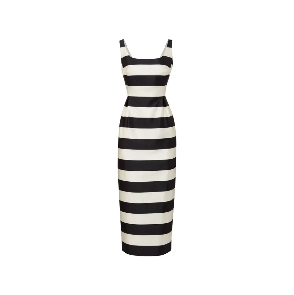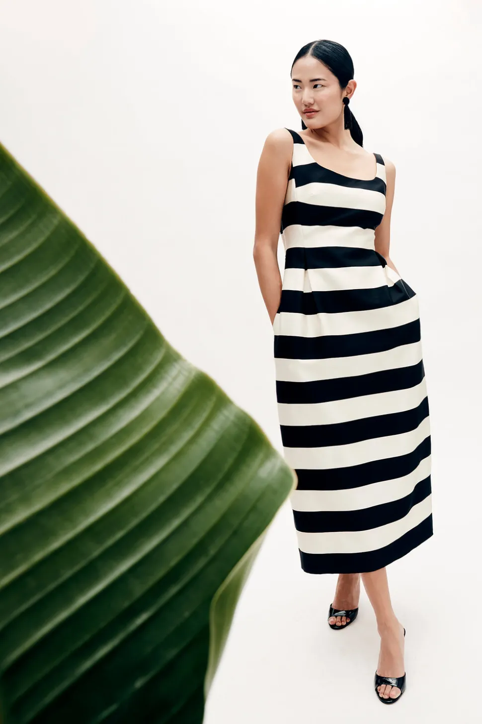 MAE New York seeks to revitalize New York’s historical garment district by creating small-batch and made-to-order collections—modern interpretations of 1960s glamor—highlighting tailoring, luxury materials, and craftsmanship. The Kendall Dress in High Line Stripe is the ultimate event-ready companion, combining timeless elegance with modern sophistication. Tailored to flatter, her classic black-and-white stripes create a striking silhouette, while a long back slit ensures ease of movement and a touch of allure.