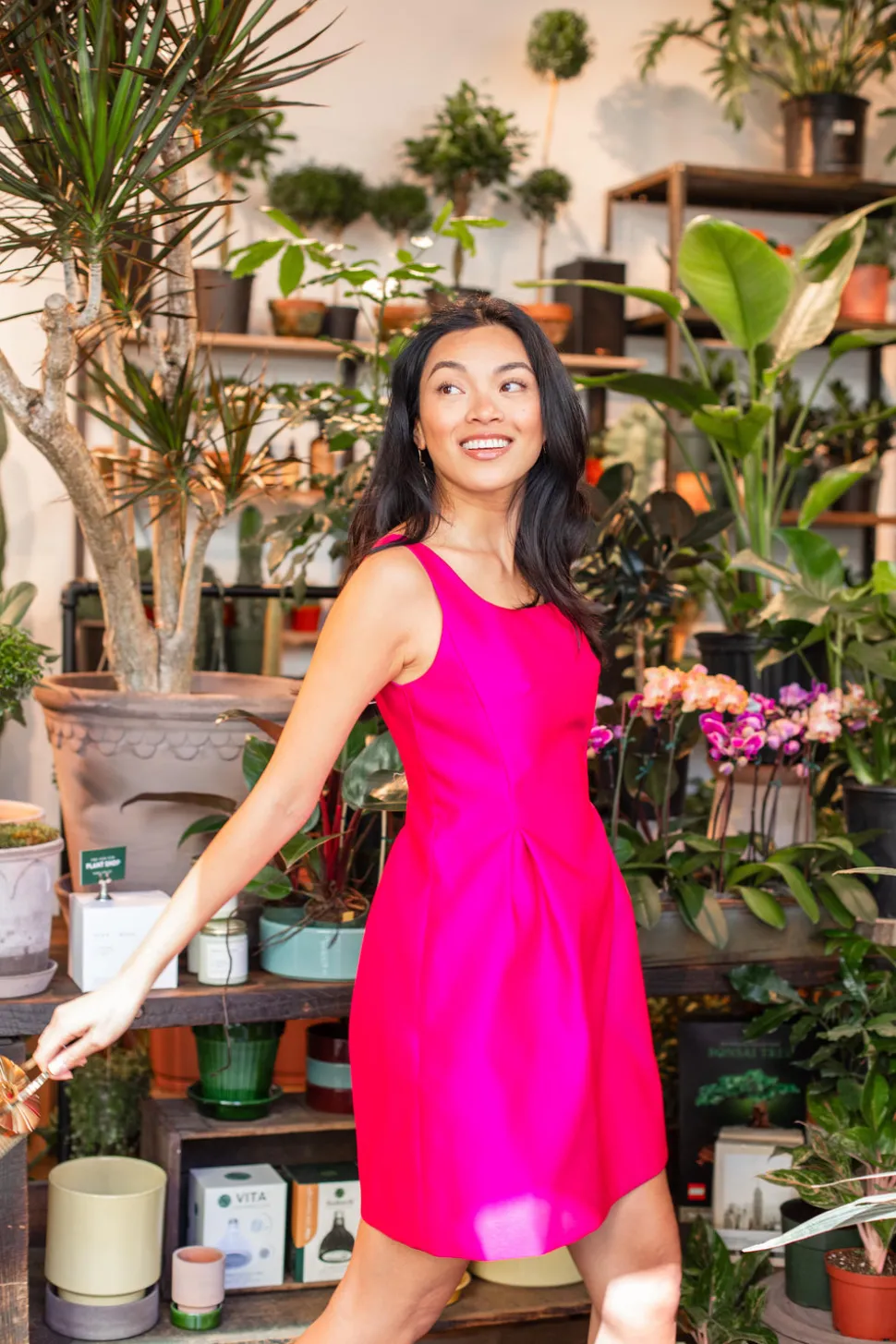 MAE New York seeks to revitalize New York’s historical garment district by creating small-batch and made-to-order collections—modern interpretations of 1960s glamor—highlighting tailoring, luxury materials, and craftsmanship. The made-to-order Kendra Dress is designed with a fitted bodice and inverted pleated skirt, offering a flattering fit and just the right length to bring sophistication, and fun, to your every day.