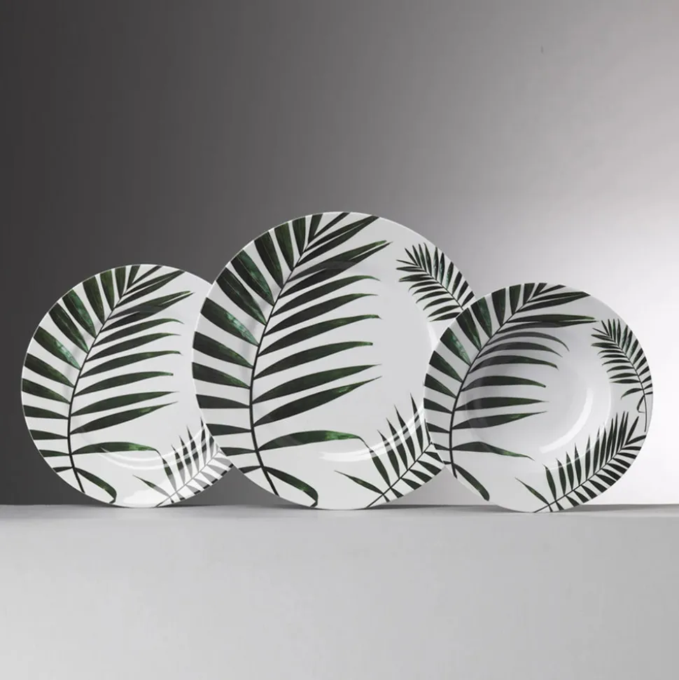 BPA-free melamine. Freezable. Decorated with green palm leaf motif. Ideal for indoor and outdoor dining.