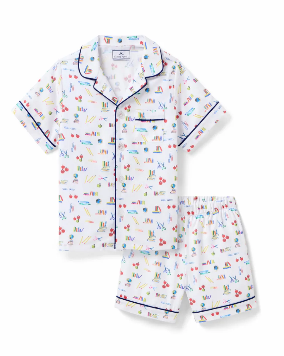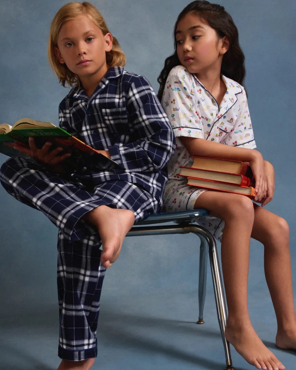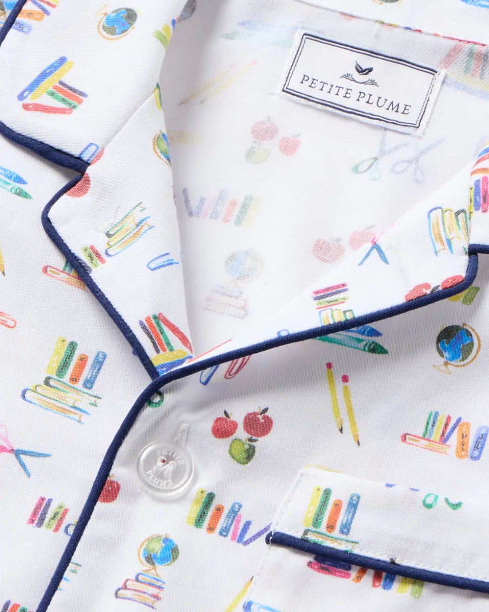 Petite Plume wishes you a “bonne nuit,” and in their luxury sleepwear, it’s hard not to oblige. The rush of finding new school supplies, captured in a print. This one always understands the assignment. This Classic Short Set is accented with contrast piping and finished with buttons.
