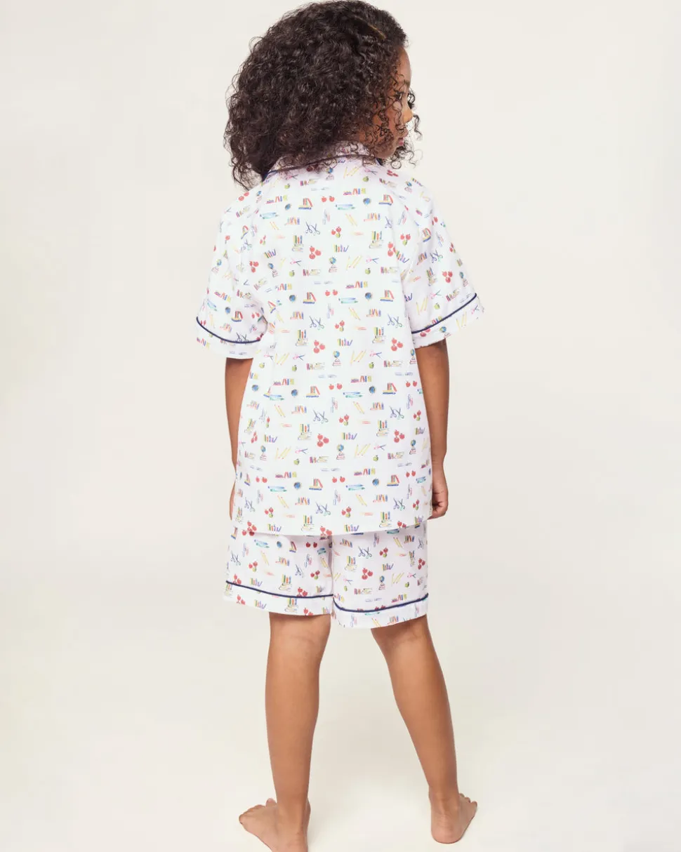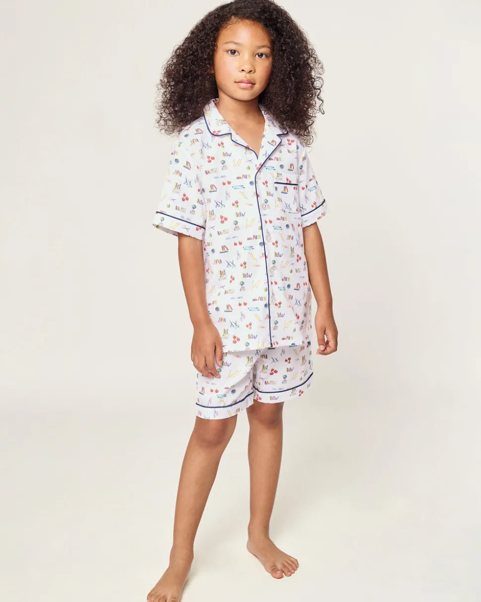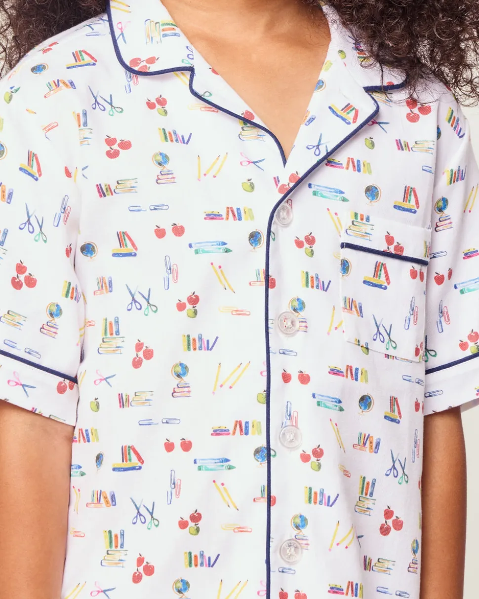 Petite Plume wishes you a “bonne nuit,” and in their luxury sleepwear, it’s hard not to oblige. The rush of finding new school supplies, captured in a print. This one always understands the assignment. This Classic Short Set is accented with contrast piping and finished with buttons.