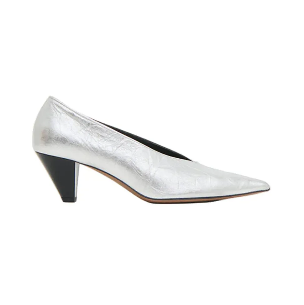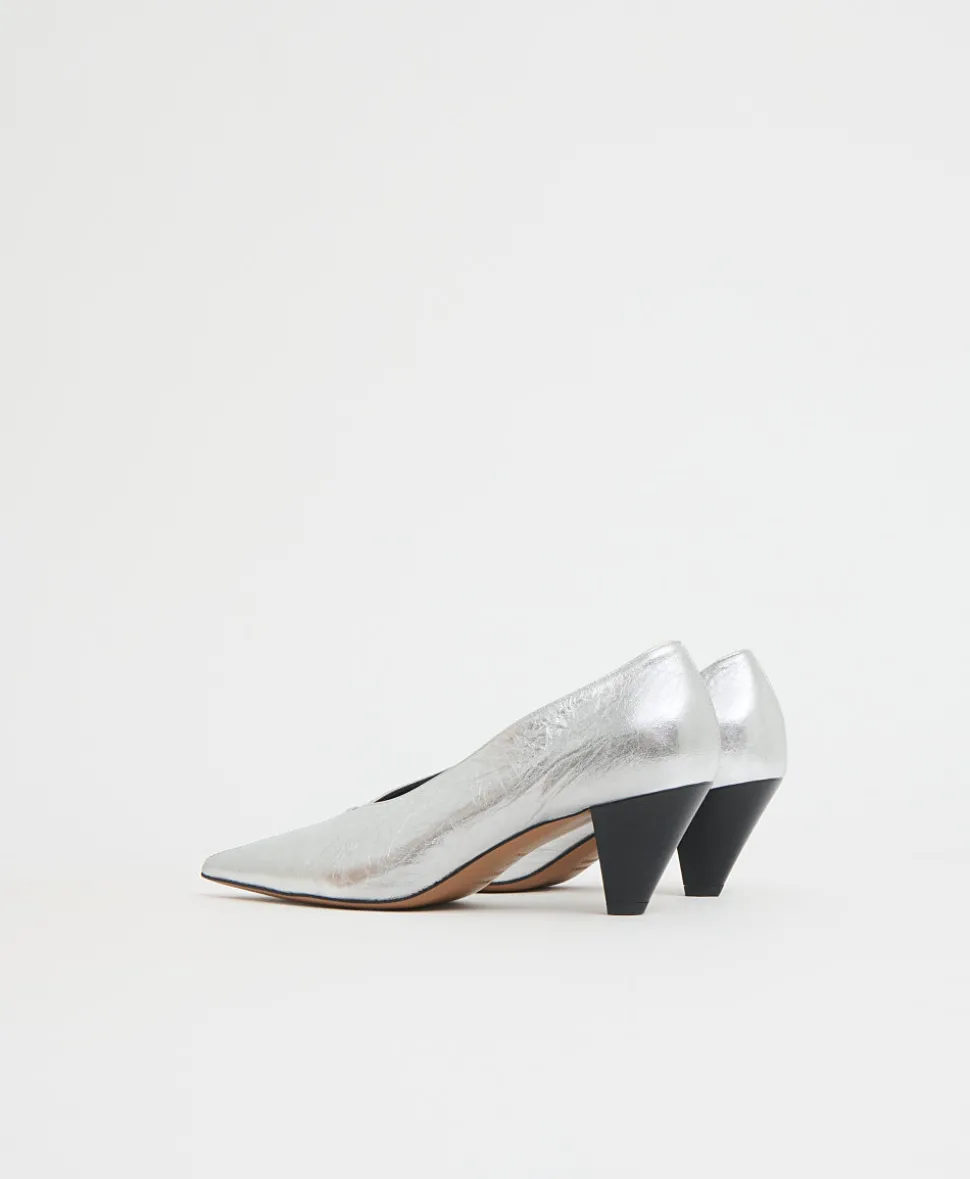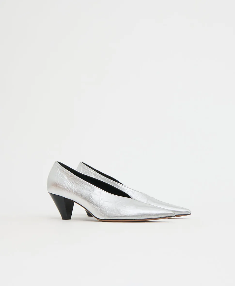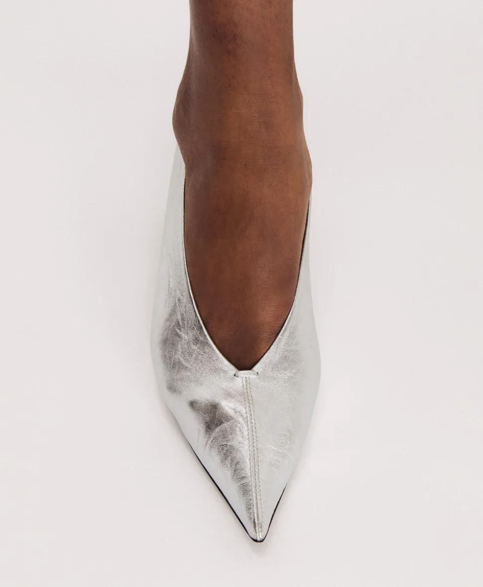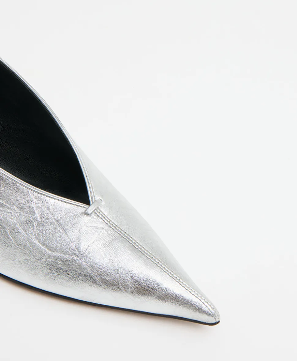 Founded in 2013, Mansur Gavriel redefines luxury through its distinctive approach to color and form. Born out of a passion for art and design, Rachel Mansur and Floriana Gavriel created two simple silhouettes—launching with just a bucket and tote. The brand’s designs, dreamt up in New York and crafted in Italy, continually challenge the notions of what expression can be. Sleek and sculptural, the Kiki Heel iin Crinkled Silver s defined by its razor-sharp silhouette, featuring a pointed toe, refined V-cut vamp, and a striated two-inch heel for an effortlessly modern finish.