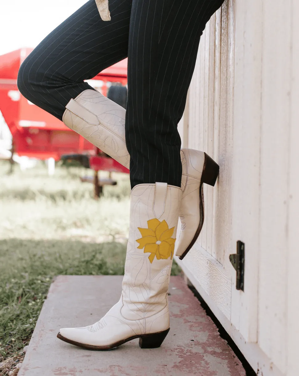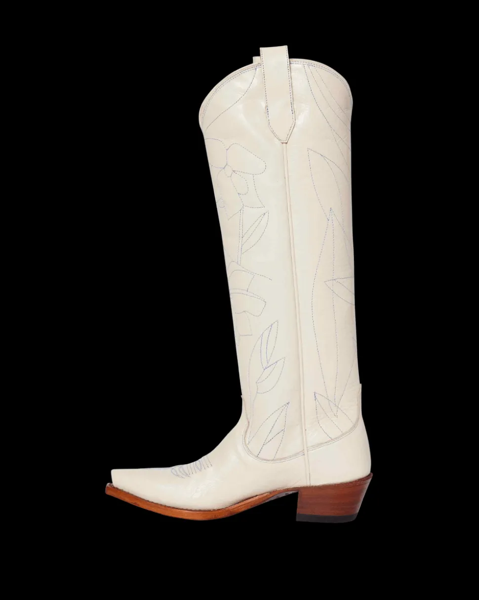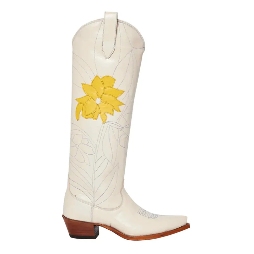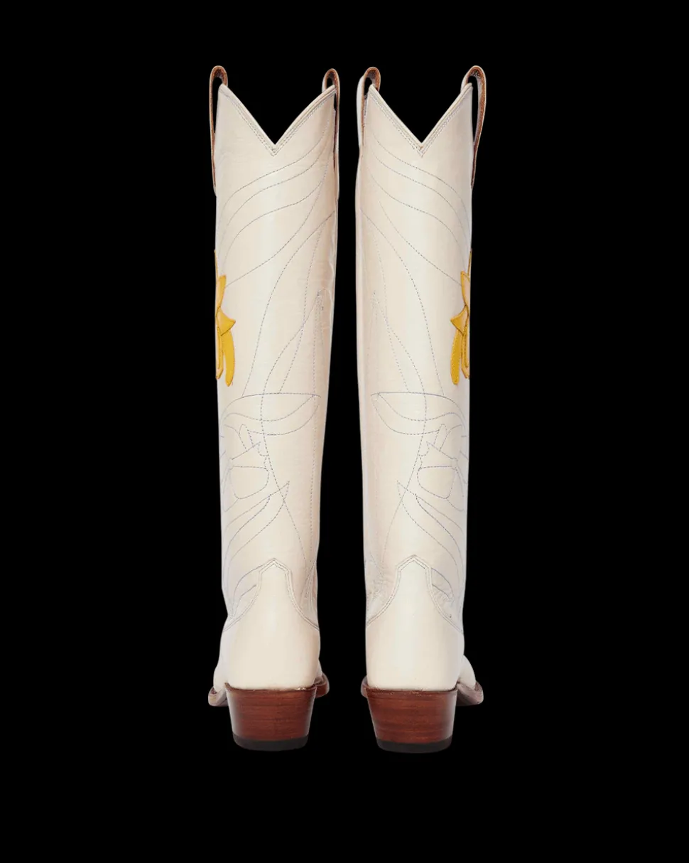 Founded by sisters Lizzie Means Duplantis and Sarah Means, Miron Crosby is inspired by the sisters’ experiences of growing up on their family’s West Texas cattle ranch, and later living and working in New York City. The artisanal boots are designed in New York, handmade in Texas, and created with love for every bride. Embrace higher horizons with the Kristin Crème. This boot elevates every ensemble, boasting a captivating blend of delicate details and sleek lines. Crafted in Crosby Crème and adorned with powder blue stitching, the buttercup yellow curving daffodil embellishment steals the show. The multi-layer appliqué is meticulously done by hand. Handmade in Texas and crafted of the finest materials, these cowboy boots are a statement of quality, artistry, and style. Make them your own by customizing them with your monogram on the exterior shaft uppers and your wedding date on the ear pulls. Available exclusively for custom order, please allow 6-8 months for production.