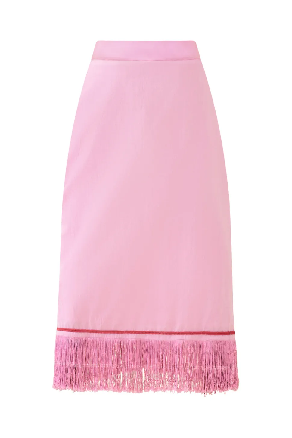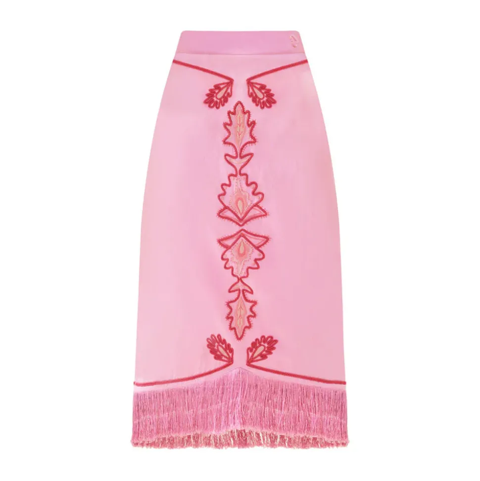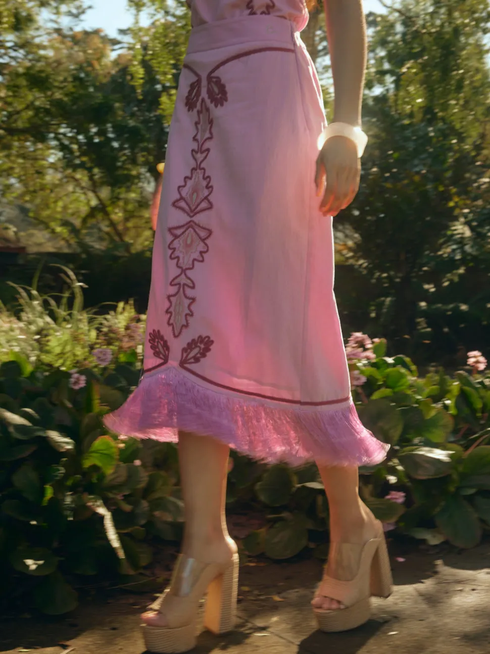 Tomboy looks, girly-girl styles, and an always fashionable approach define EDDY’s aesthetic. With a focus on bold and feminine silhouettes, EDDY dresses and tops pair elevated California bohemian with global inspiration; these are clothes designed to make you feel good inside and out. The Kya Skirt in Purpink is crafted from a pink cotton-linen blend with violet-toned rope embroidery and a tailored fit through the hips. A fringe-trimmed hem adds playful movement, while retro floral motifs down the center evoke a Slim Aarons–inspired resort feel. Pair it with a crisp white button-up or the coordinating Lucia Top.