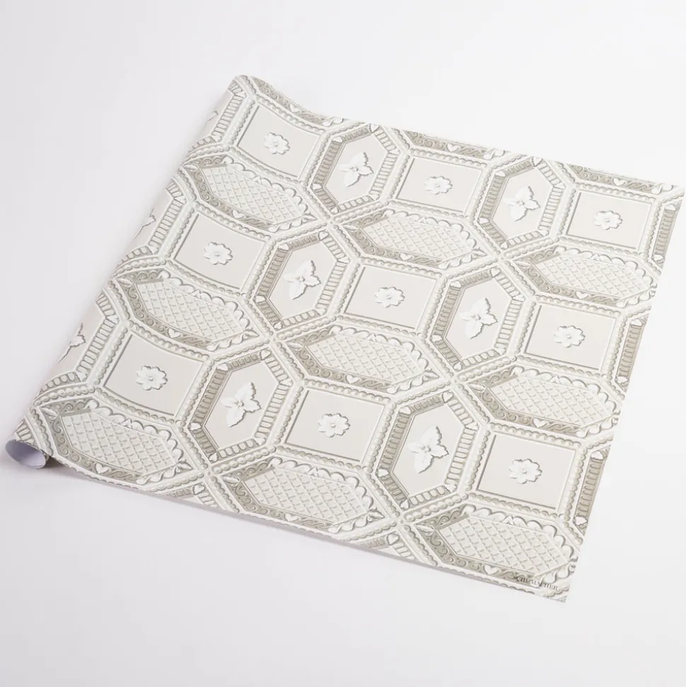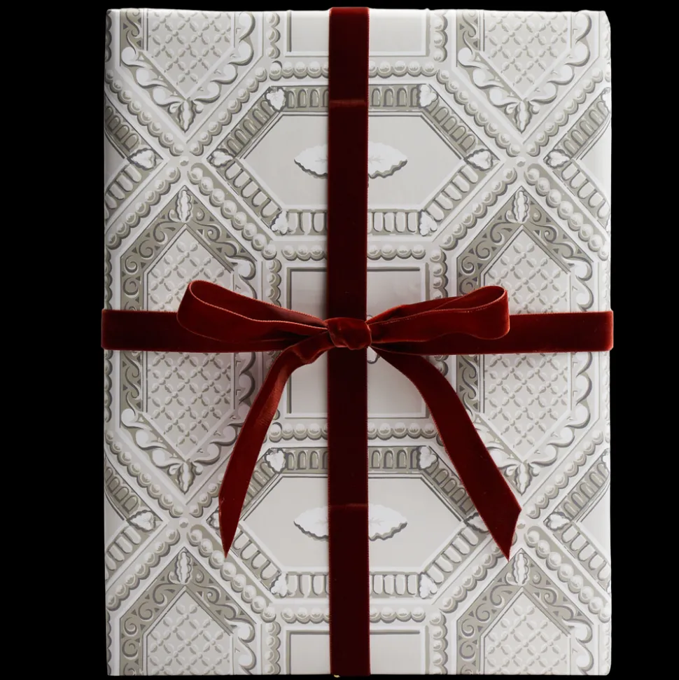 Founded by Frederic Schumacher in 1889 on Fifth Avenue in New York, Schumacher design transcend trends and time with generations-tested unwavering devotion to beauty and quality. Their luxury pillows, fabric, wallpaper, furniture, and paper products allow decorators and shoppers alike to create with total confidence. Calling out to the coffered ceilings of McKim, Mead & White, the Lacunaria Wrapping Paper In Stone is lusciously thick and features crisscrossing beams and stylized rosettes that add a delicate flourish, and making every gift exceptional.