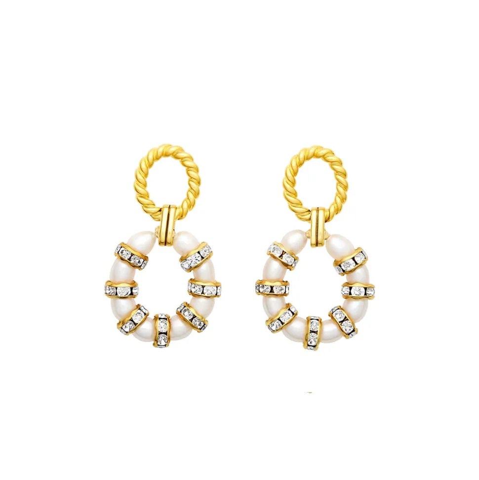 Hoops of alternating freshwater pearls and Swarovski® rondelles hang from 24K antique gold-plated twisted cable toppers on stainless steel hypoallergenic posts. Featherweight. Please note that no two pearls are exactly the same; slight variations in size, color, and detail add to their beauty.