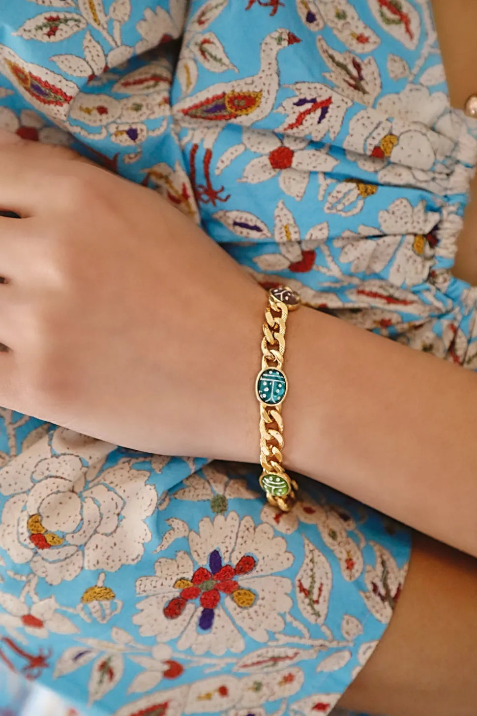 The mother-daughter duo behind Brinker + Eliza combine their experience in metalsmithing and fashion to create incredibly unique jewelry that feels custom-made. Employing pearls, shells, and earth’s most prized organic forms, these are pieces to be not just worn but treasured. Ideal for layering, the Ladybird Bracelet boasts oval carved glass ladybug cabochons set on 24K antique gold-plated curb chain.