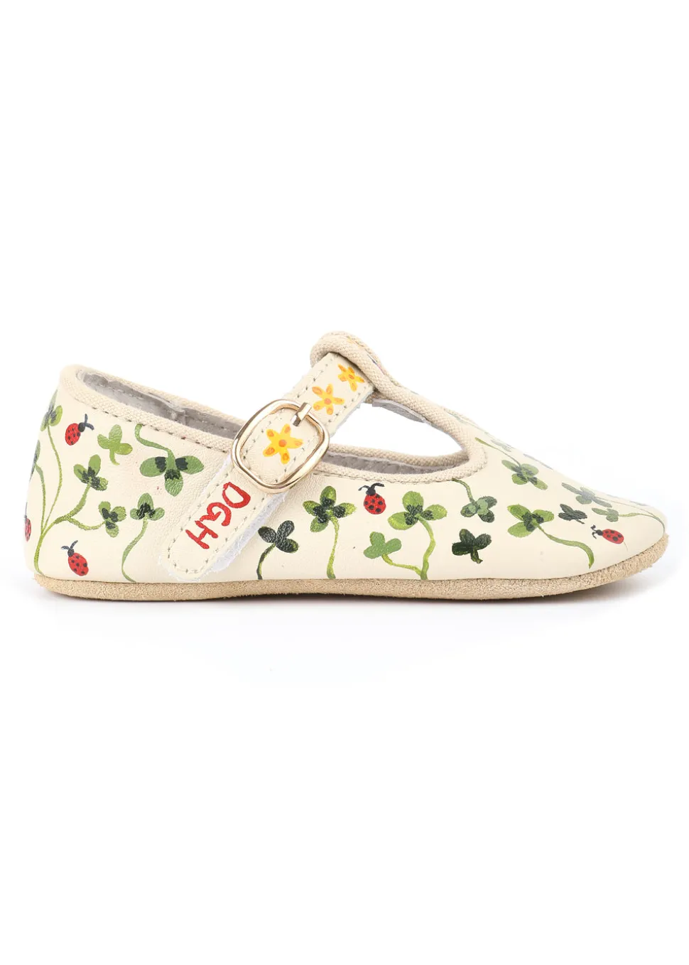 Napa leather. Design features clovers, ladybugs, and daisies.
