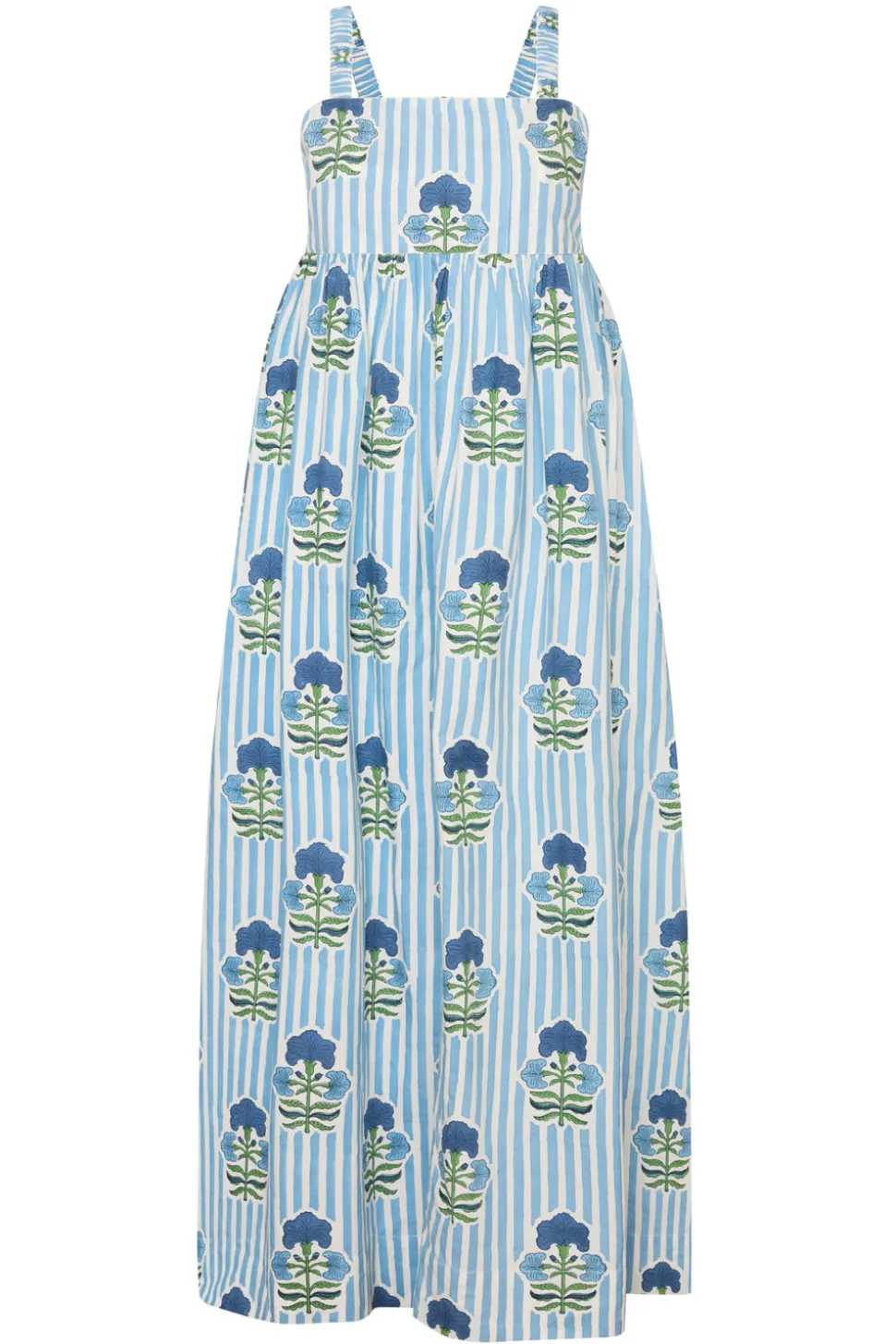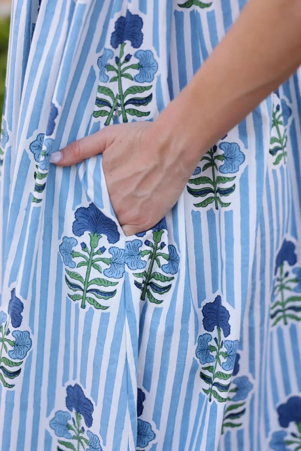 Introducing Maison Marigold, a new luxurious small-batch women’s resortwear brand inspired the wanderlust of travel. Our collections effortlessly transition from beachside lounging to an elegant evening on the town. The simplicity of design and classic silhouettes are the foundations for each and every style. Hand-printed linen and cotton make for comfortable and effortless pieces that are both feminine and flattering. The Laguna Sun Dress in Blue & Green was designed as a classic no-fuss sundress. The empire waist and low back makes this timeless silhouette feminine and chic. It features a face-framing square neckline, elastic straps and hidden side seam pockets. The Laguna Sun Dress is crafted from crisp cotton poplin that’s airy and light with just the right amount of structure. Wear it casually with sneakers to the market or dress it up with your favorite sandals.