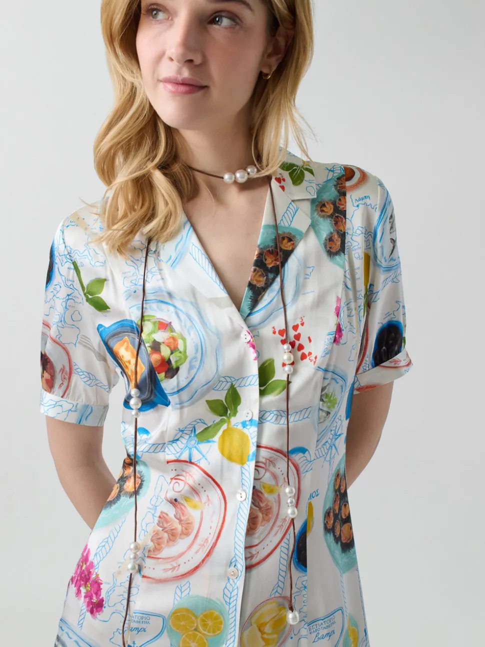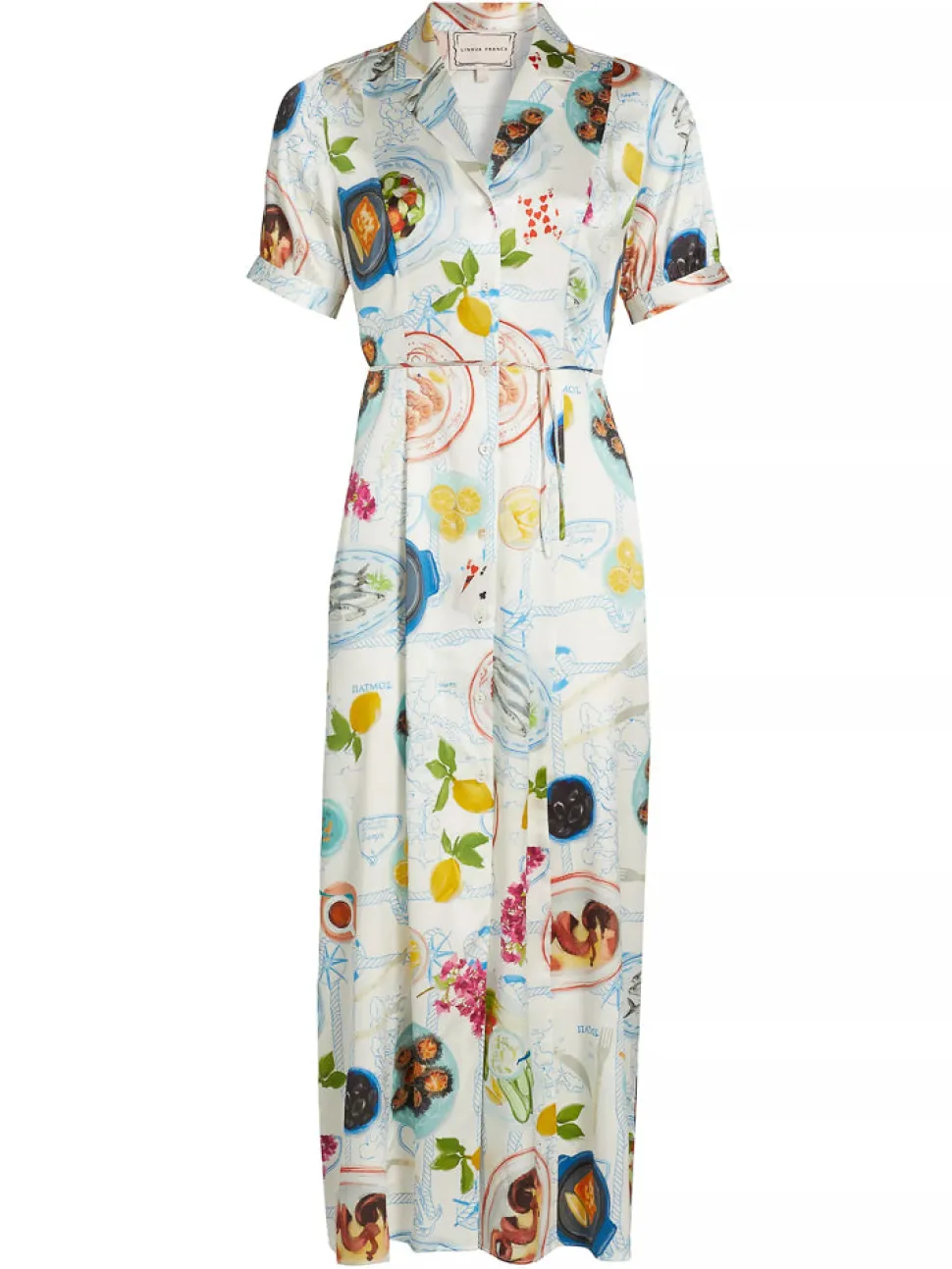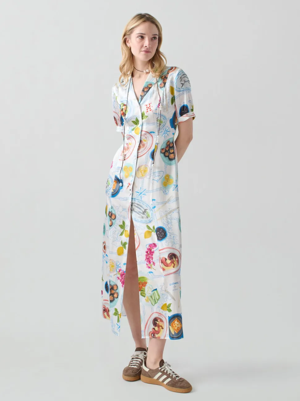 Lingua Franca is a line of sustainably-sourced, fair trade luxury ready-to-wear and cashmere pieces, all hand-stitched by women in New York City. Every word on Lingua Franca’s staple pullover sweaters is chalked in script by designer Rachelle Hruska MacPherson before it is ever stitched. Lampi Fish Tavern, located on the beautiful pebbled beach of Lampi in Patmos, is the brand’s all-time favorite spots for lunch. Their specialty? The irresistible flaming halloumi cheese. The hand-painted Lampi Button Down Dress in Lunch is inspired by a photo Rachelle took of my table there last summer, capturing all the essentials of a wonderful Greek lunch.