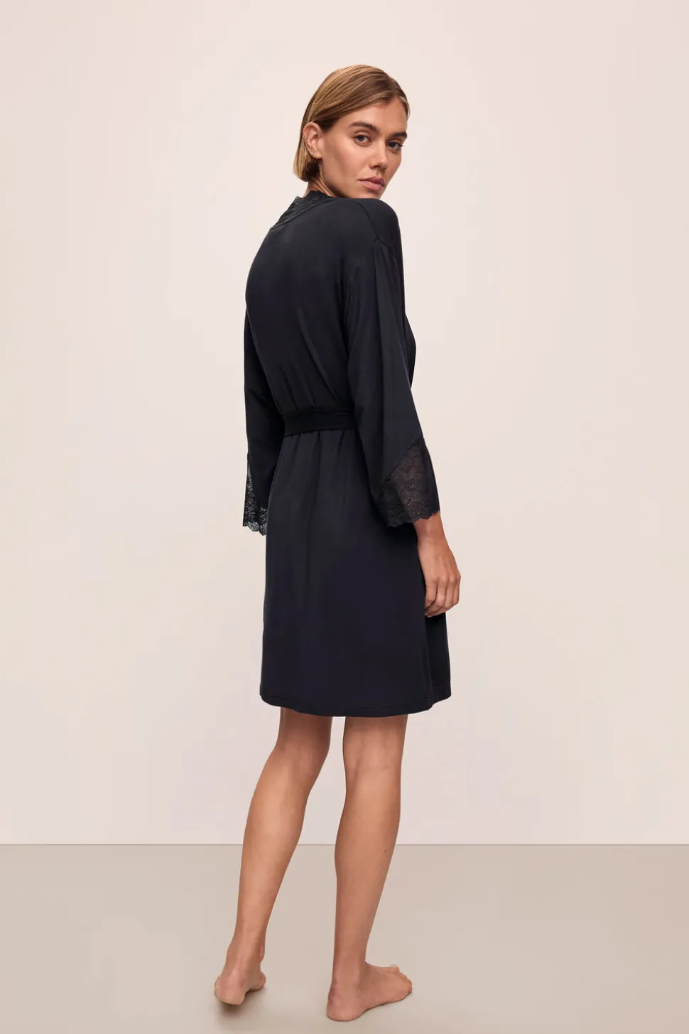 Body: 95% lenzing TENCEL™ Modal, 5% elastane. Lace: 49% recycled nylon, 20.14% elastane, 19.19% nylon, 11.67% polyester. Fitted triangle cup bodice Long sleeve short robe. Adjustable belt. Interior tie for security. Lace neckband and angled lace inset at sleeve. Locker loop at back neck. Relaxed, feminine fit. Imported.