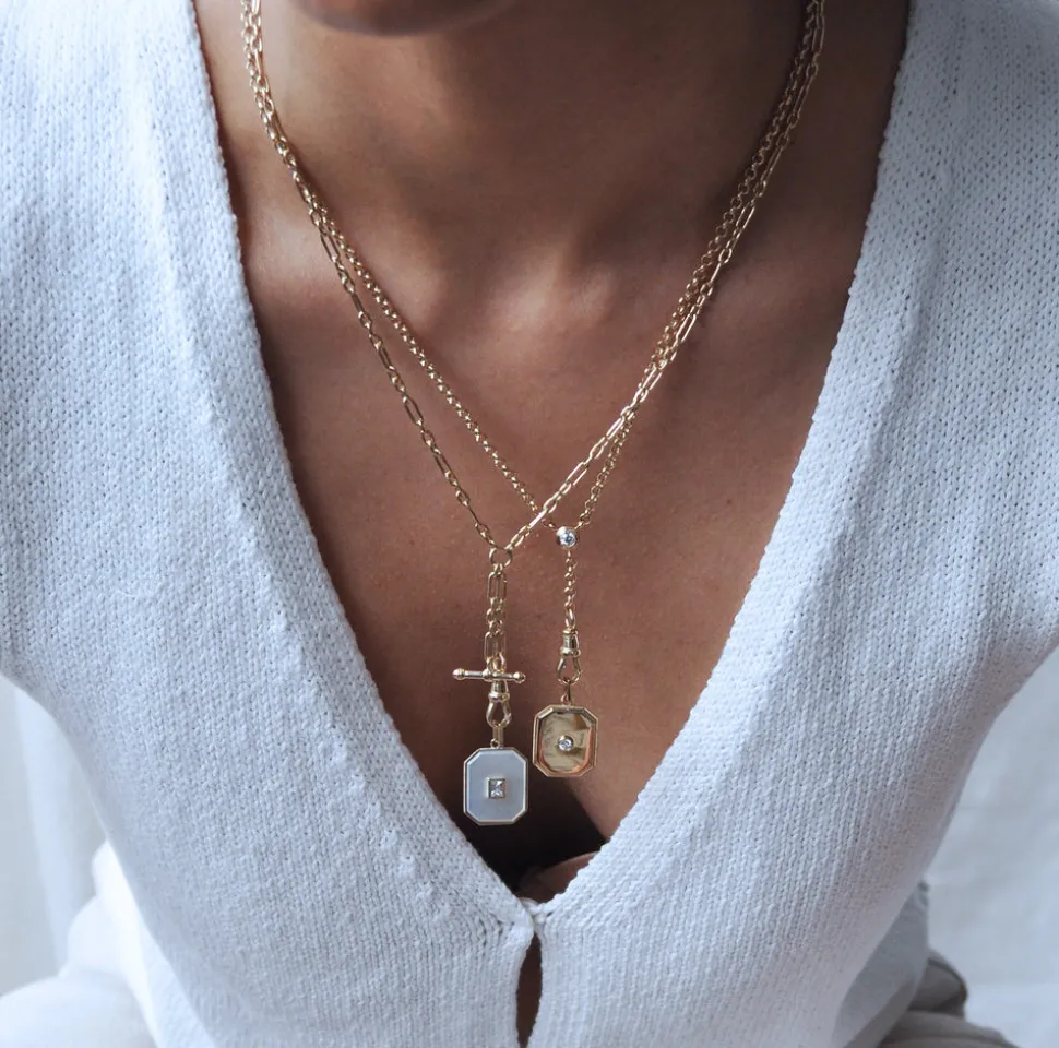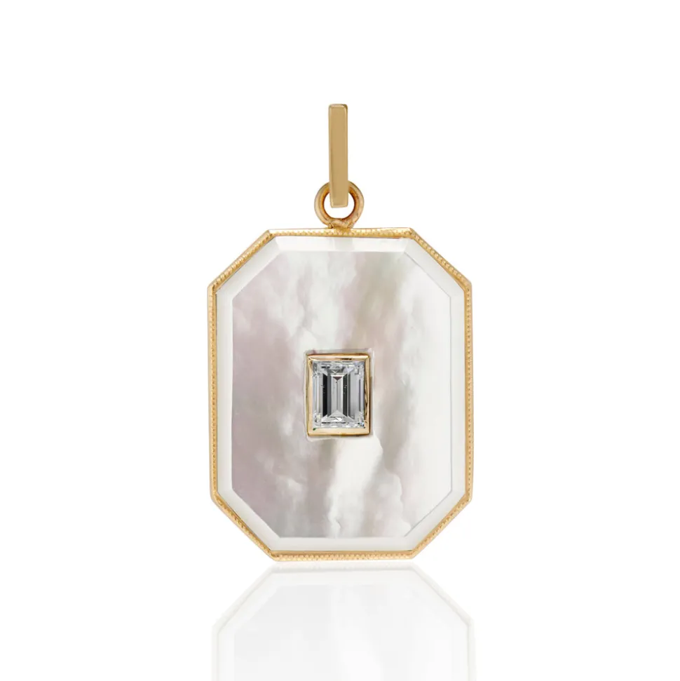From her studio in New York City, Ashley Zhang designs one-of-a-kind fine jewelry that will last a lifetime. The Large Mother of Pearl Diamond Baguette Bezel Charm is a vintage inspired pendant, custom carved with a white baguette cut diamond in its center, set on the brand’s signature rectangle bail.