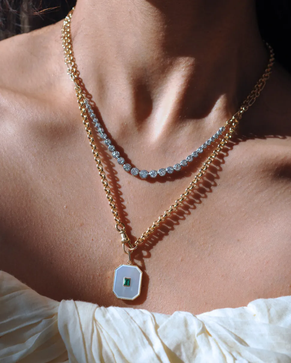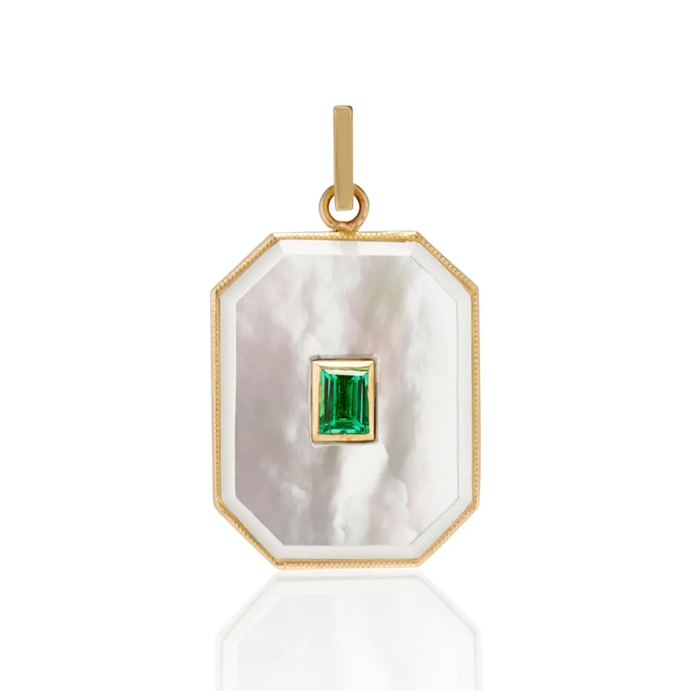 From her studio in New York City, Ashley Zhang designs one-of-a-kind fine jewelry that will last a lifetime. The Large Mother of Pearl Diamond Baguette Bezel Charm is a vintage inspired pendant, custom carved with a white baguette cut diamond in its center, set on the brand’s signature rectangle bail.