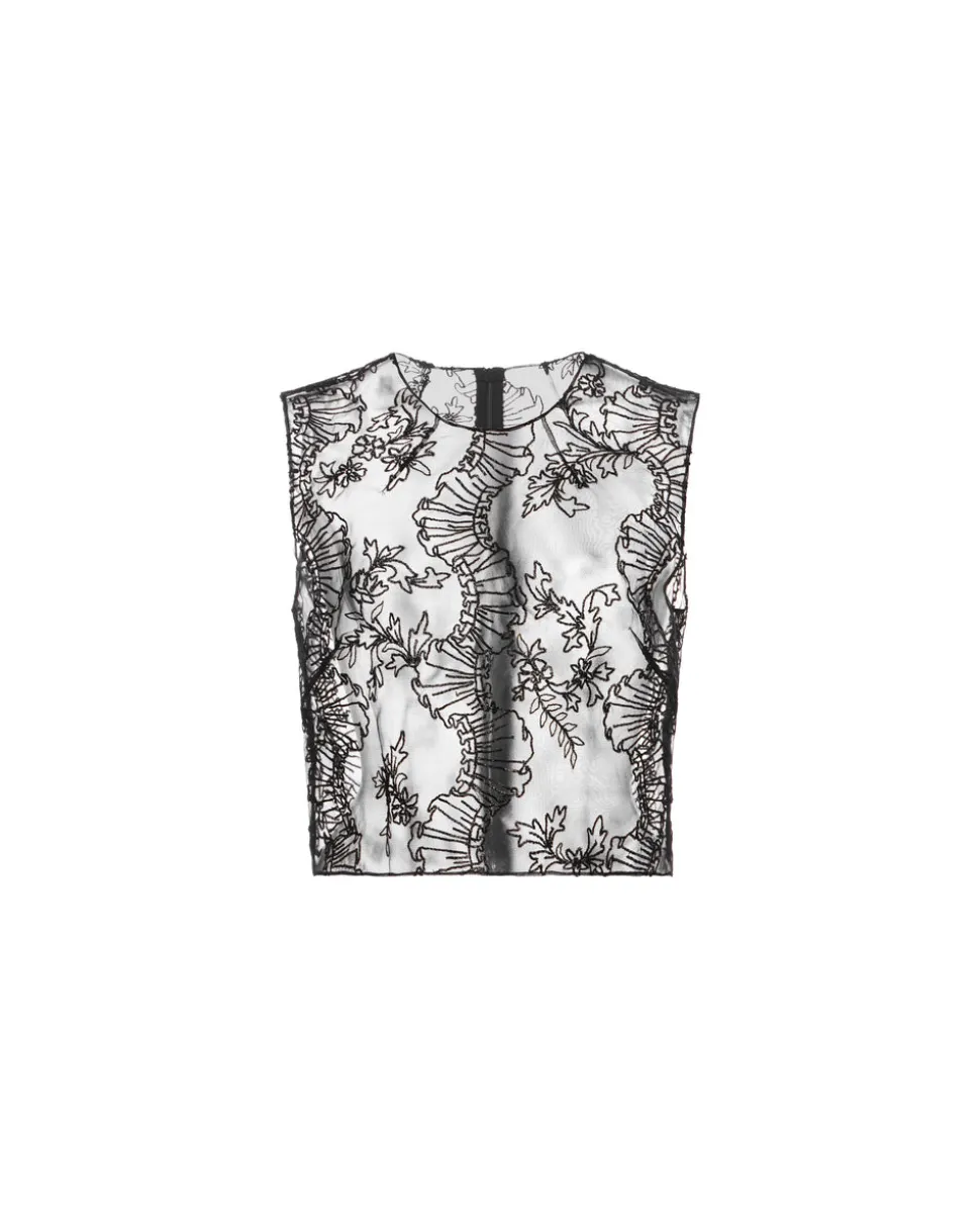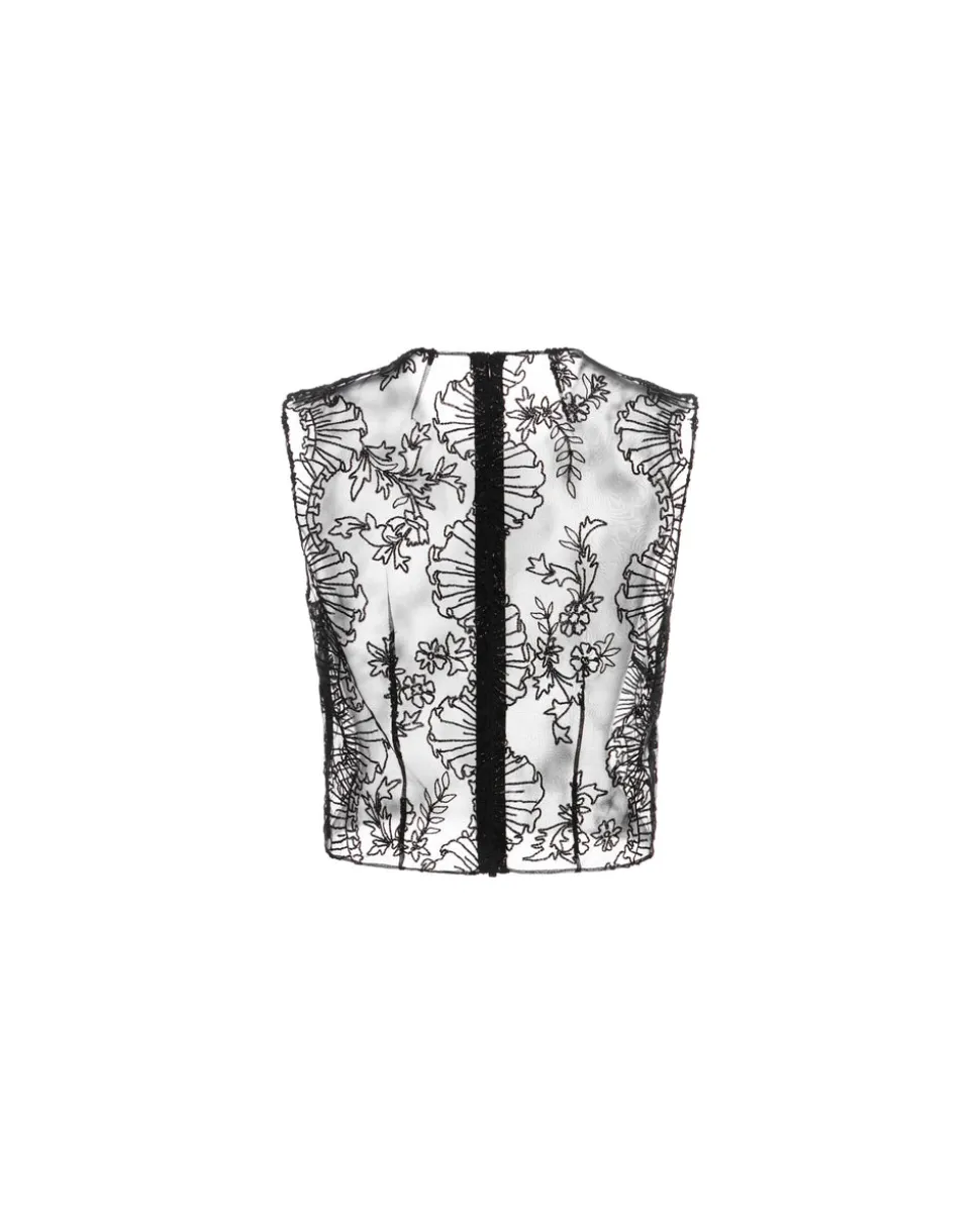 A graduate of the Savannah College of Design, award-winning Alexandra Pijut’s namesake line arrives from her studio in New York, offering luxe ready-to-wear pieces that distinguish themselves between femininity and practicality. The Laurence Top is crafted in black silk organza and features trompe l’oeil ribbon embroidery inspired by the Rococo era. This minimalist silhouette features neck and bust darts for a flawless fit.
