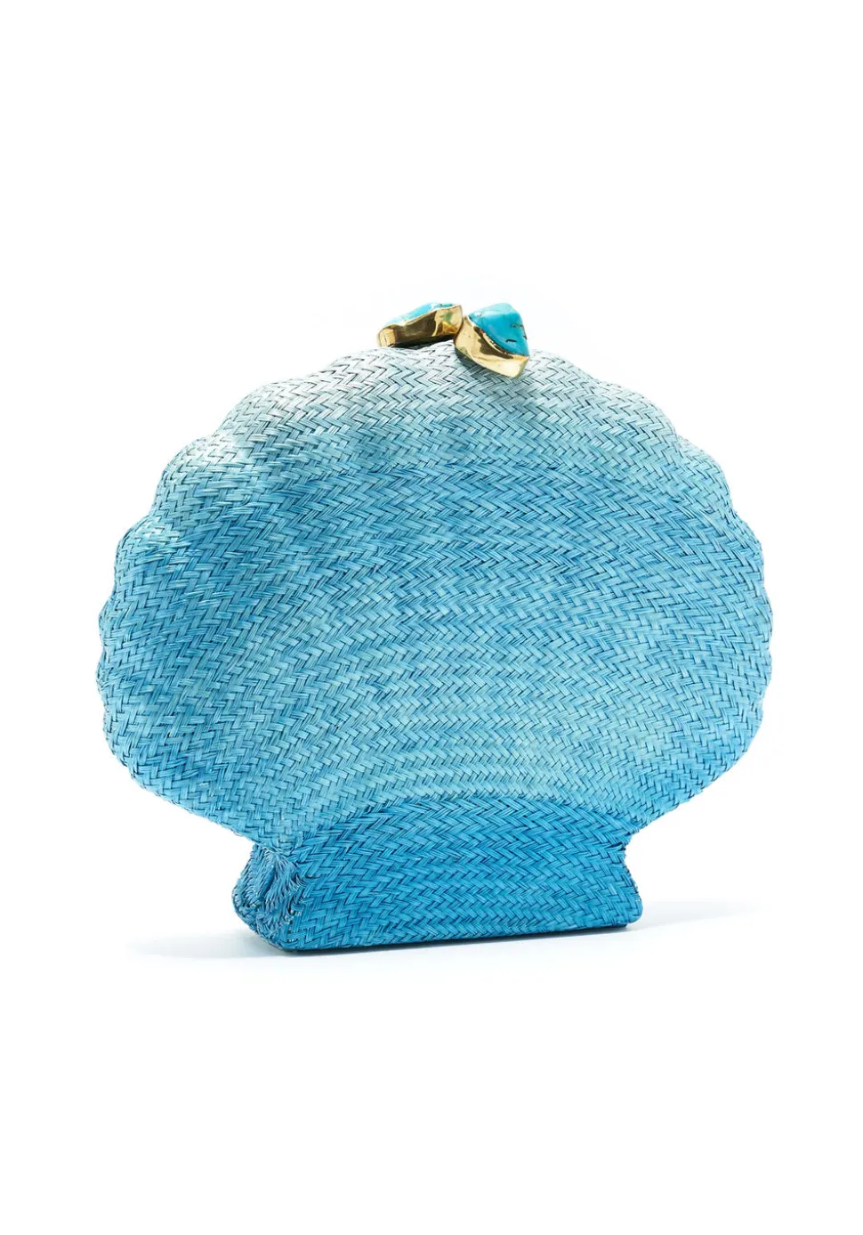 Ocean blue ombre woven Buntal, turquoise stone closure, brass, black matte satin lining. Strong magnetic closure. Comes with a 44″ detachable chain.
