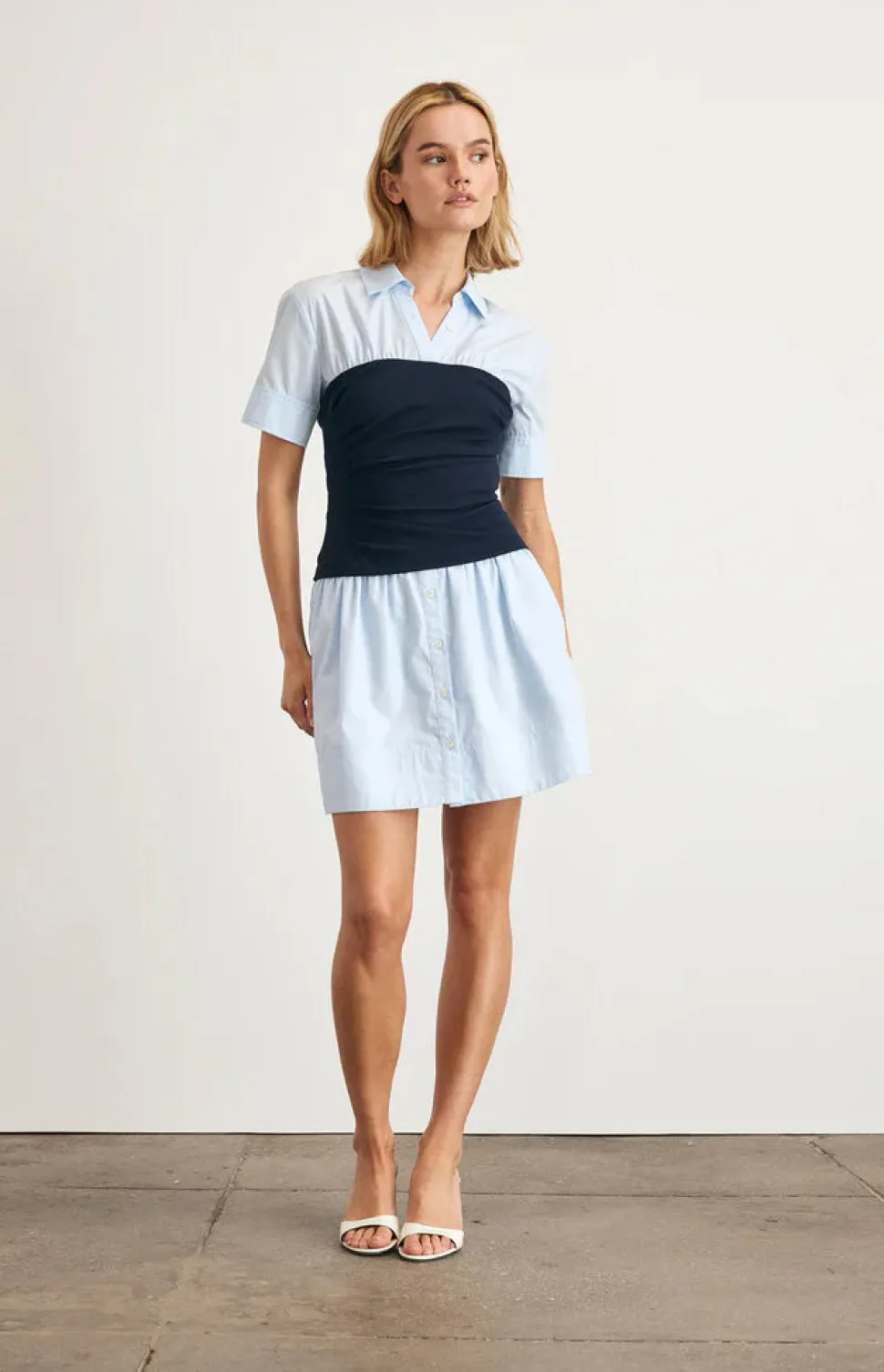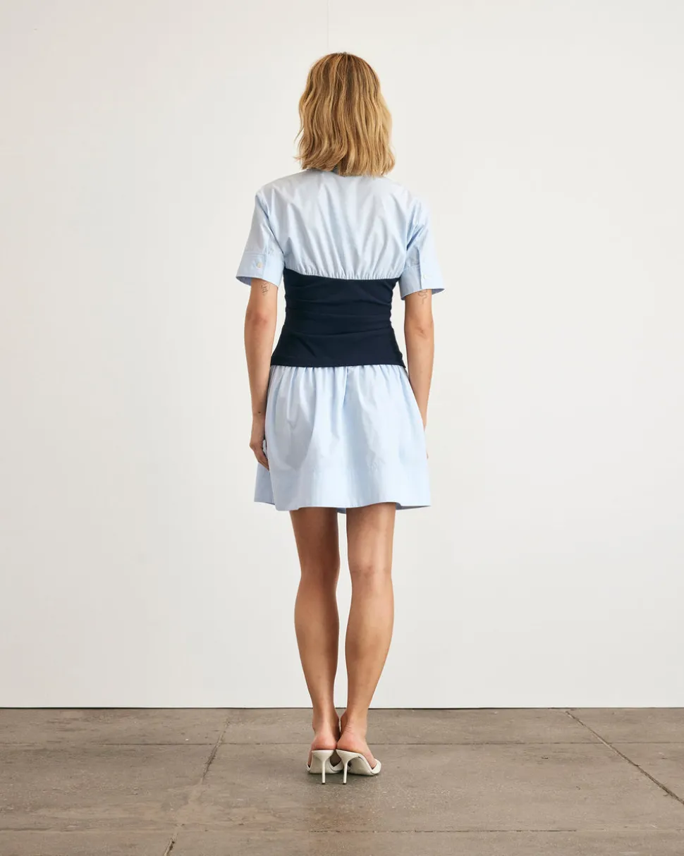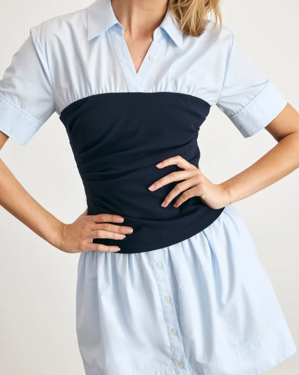 Skirt: 100% cotton. Bodice: 95% polyester, 5% elastane. Lining: 100% cotton. Mini length. Collared V-neck. Short sleeve. Lined bodice. Cotton poplin shirting. Scuba crepe tube top. Button up above and below tube top. On seam pockets. Hidden side zipper.