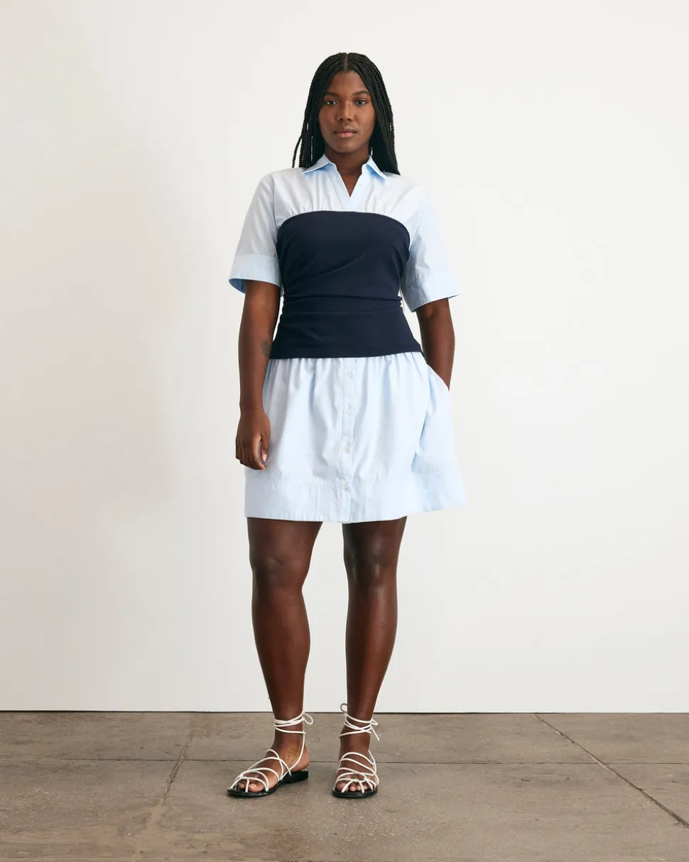 Creating clothing that inspires confidence, celebration, and community, Tanya Taylor is a New York-based womenswear brand whose mission is to provide practicality and style to a range of ready-to-wear in inclusive sizes. Each collection is thoughtfully designed through the artful use of color, texture, and original hand-painted prints. The Leanne Dress in Oxford Blue & Maritime Blue is a take on a classic mini shirt dress, elevated with fresh detail and just the right amount of attitude. Featuring a collared v-neckline, on-seam pockets, a luxe scuba crepe tube top, and a button up cotton poplin skirt, Leanne is a combo dress that delivers a playful, feminine feel with everyday polish and effortless charm.