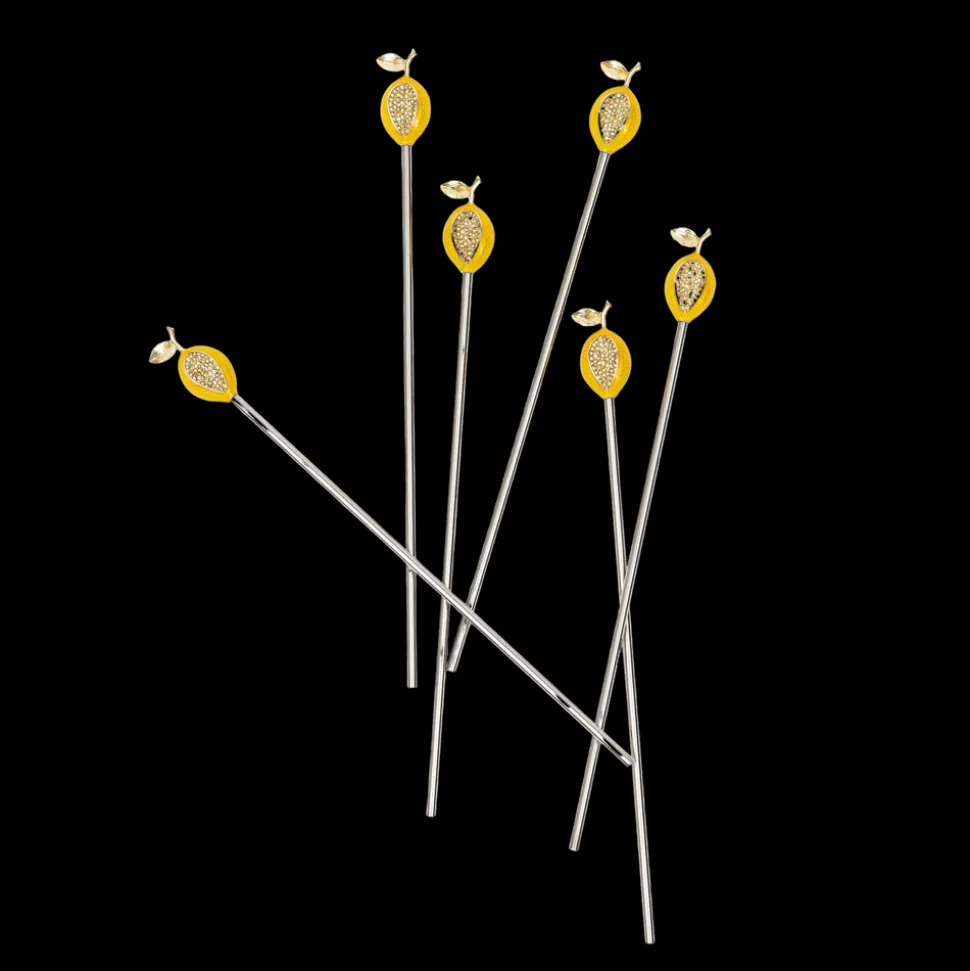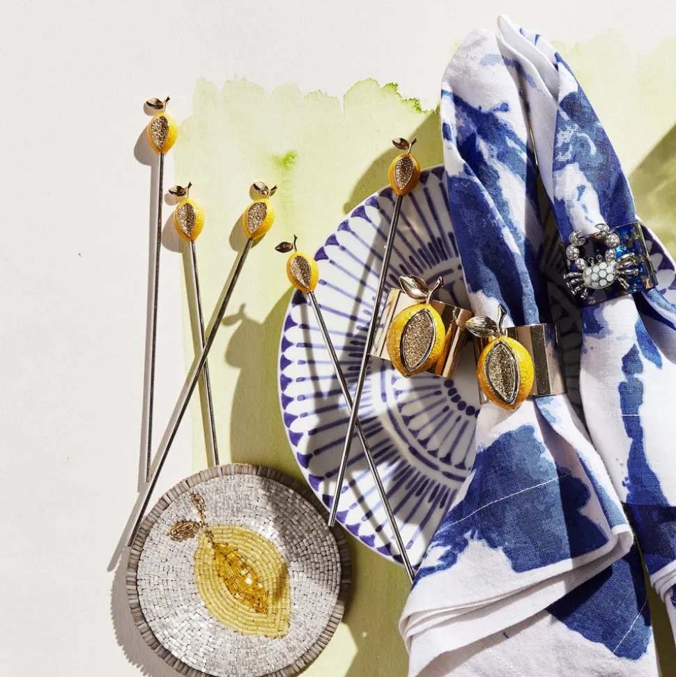 Inspired by her mother’s flare for holiday decorating, Joanna Buchanan has turned her love of travel and knowledge gleaned from twenty years in fashion retail into an eclectic line of tabletop, barware, gifts, and decor. Add a pop of dazzling color and some sophisticated flair to your barcart and cocktail hour with the Lemon Swizzle Sticks, topped with zesty accents.