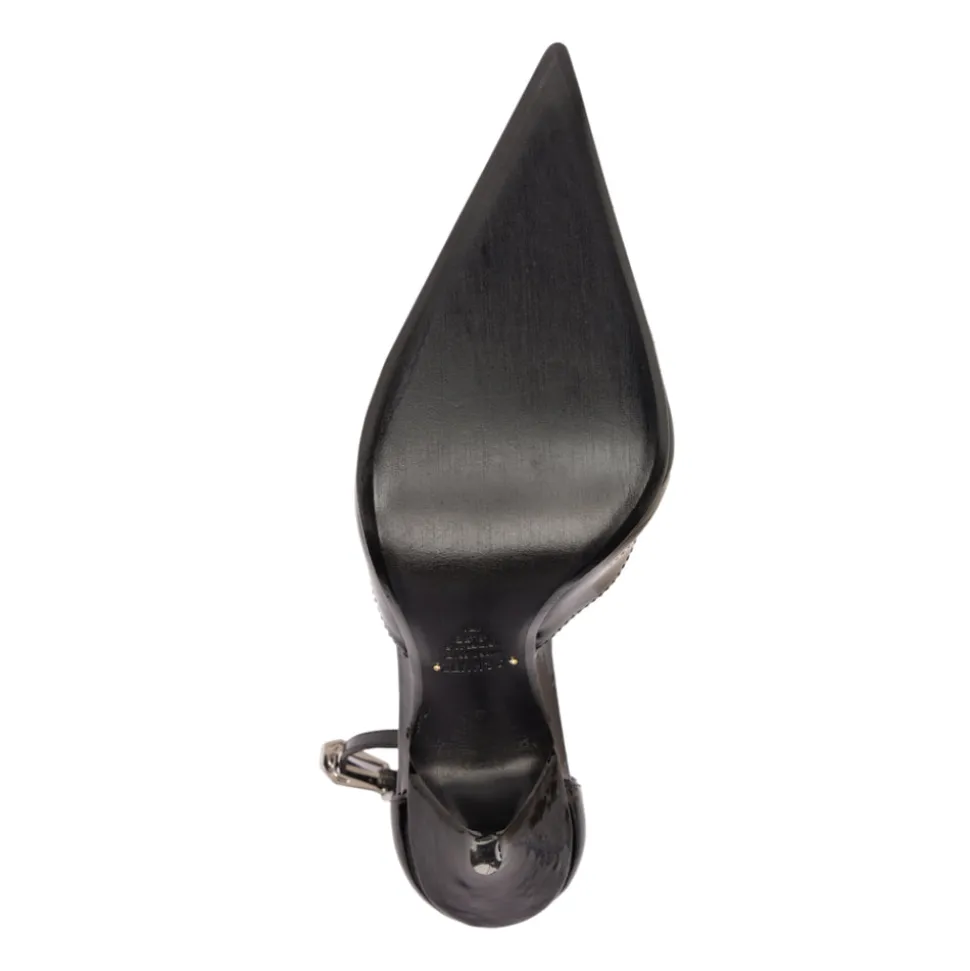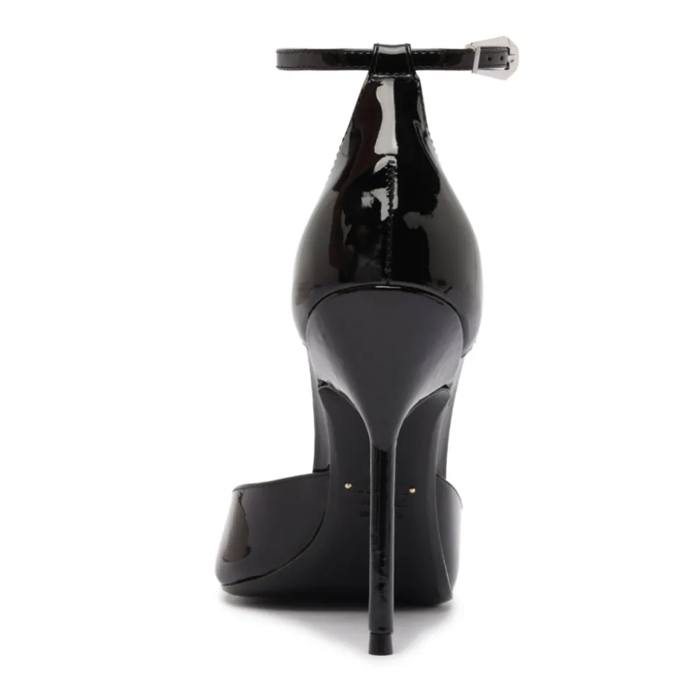 Patent leather upper. Man-made lining. Man-made sole. Pointed toe. Ankle strap. High heel.