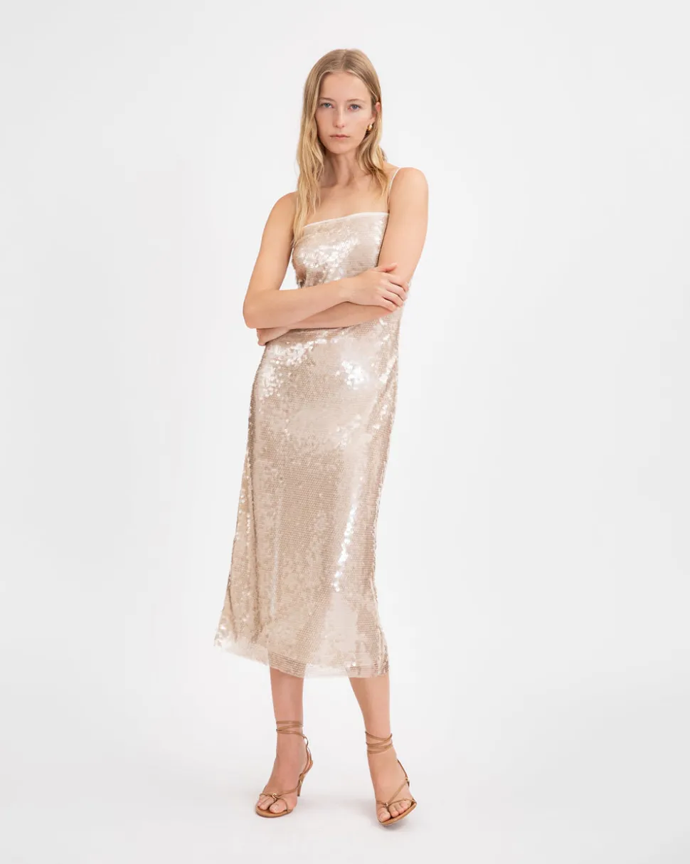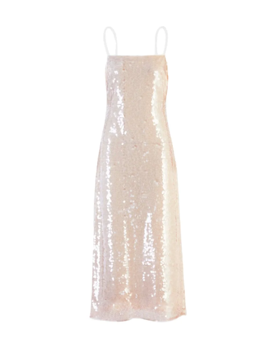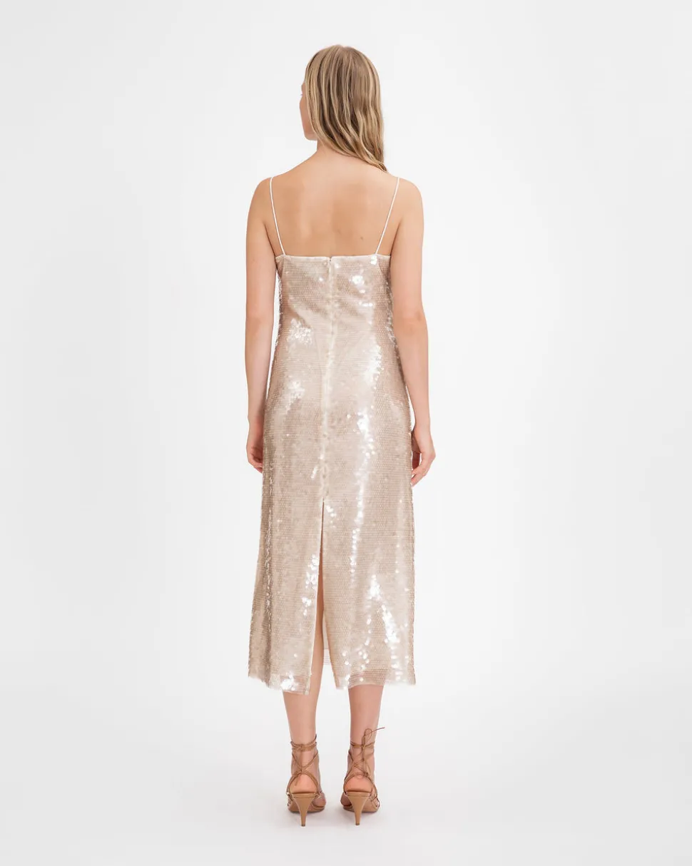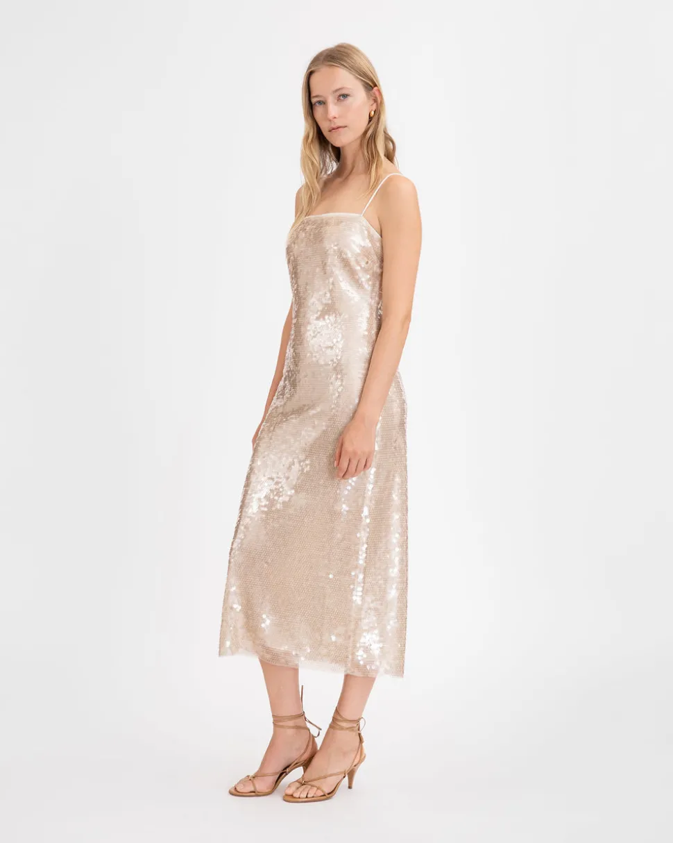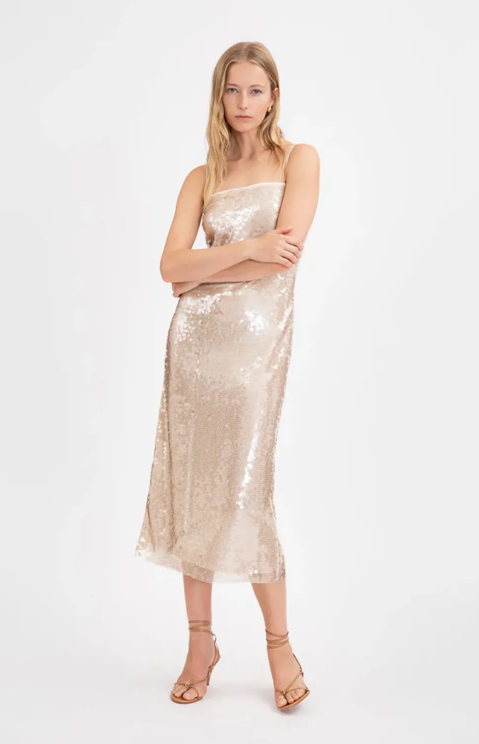 A standout silhouette of the season, the Lenox Dress is a sequined midi and our answer to event dressing this season.