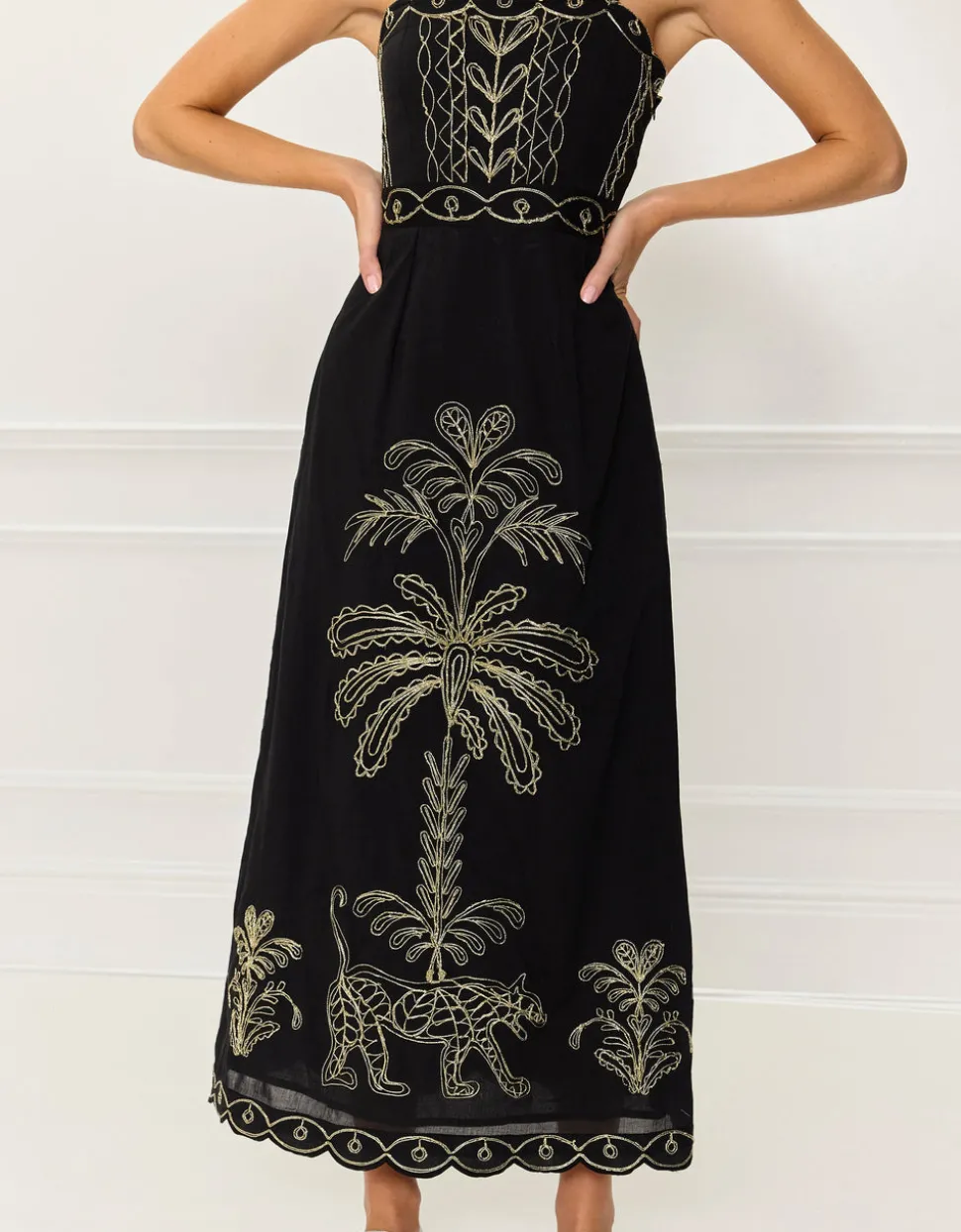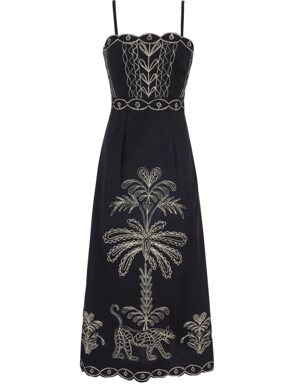 Color and creativity are the foundations of Pink City Prints, a brand inspired by founder Molly Russell’s life in Jaipur. In her inimitable dresses, you’ll find centuries of craft knowledge, expressed through unmatched quality and traditional techniques, like hand embroidery, block printing, and hand-looming. Designed for evenings that call for effortless glamour, the Leopard Nights Embroidery Rio Dress features delicate spaghetti straps and a fluid drape. Metallic silver embroidery of leopards and palms shimmers under the light, while scalloped silver trim lends a refined finish. A minimalist yet striking silhouette, it’s a timeless style to reach for season after season.