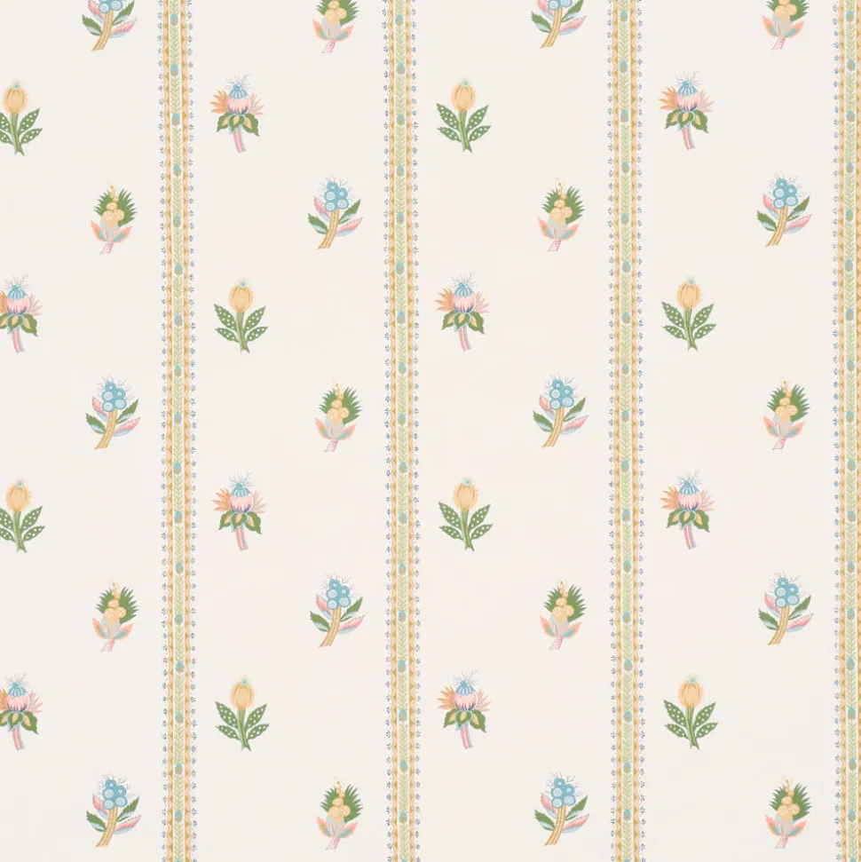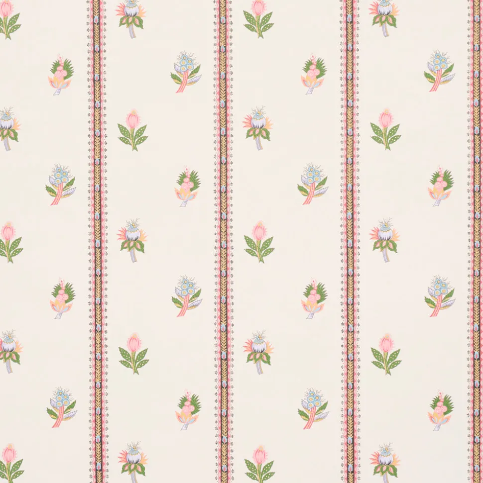 Founded by Frederic Schumacher in 1889 on Fifth Avenue in New York, Schumacher transcends trends and time with generations-tested unwavering devotion to beauty and quality. Their luxury pillows, fabric, wallpaper, trim, and furniture allow decorators and shoppers alike to create with total confidence. A wonderful design with a vintage vibe, Les Fleurs Exotiques features a unique combination of narrow vertical stripes and delicate tropical flowers. With its beautiful details and small scale, this wallpaper plays well with other patterns and is ideal for a bedroom.