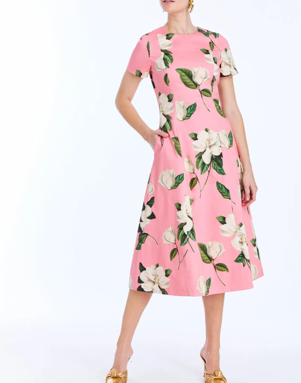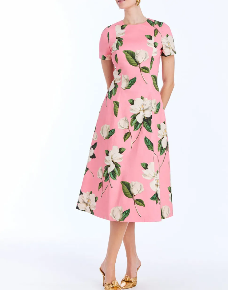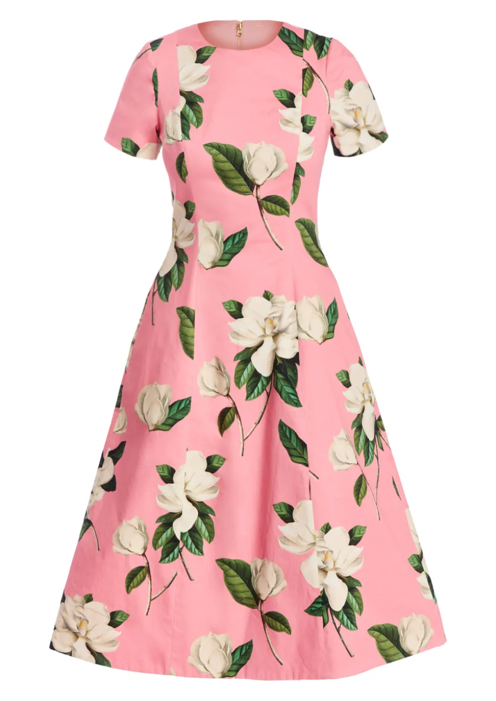 Body: 97% cotton, 3% spandex. Lining: 100% cotton. Midi-length cocktail dress featuring a crew neckline and coordinating waist belt. Convertible™ detail: This style is reversible! One side of dress is an all-over print, and other side of dress is coordinating solid color. Coordinating belt in pink. Fitted short sleeves. Zipper closure on center back. Fitted silhouette with full skirt and princess seams for shaping. Hand pockets at side seam on both sides of dress. Fully lined. Printed cotton sateen.
