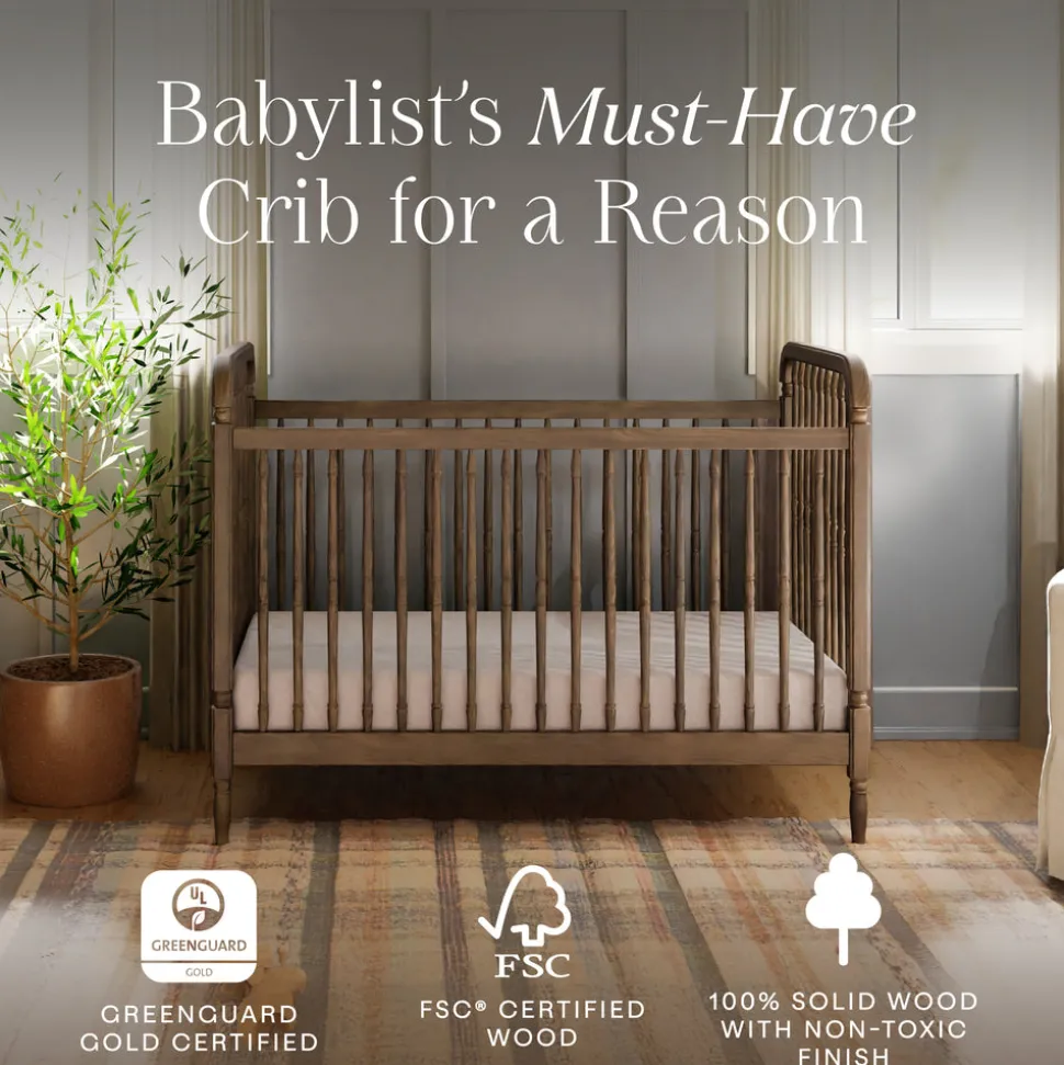 Constructed from sustainably sourced wood with thick turned spindles and a sturdy frame. Converts from crib to toddler bed and daybed with included toddler bed conversion kit. Finished in a warm natural walnut tone. Meets or exceeds ASTM and U.S. CPSC safety standards. GREENGUARD Gold Certified.