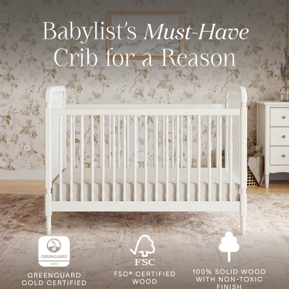 Expertly crafted from sustainably sourced wood with thick spindles and a classic frame. Includes toddler bed conversion kit to transition from crib to toddler bed and daybed. Finished in a soft warm white. Meets or exceeds ASTM and U.S. CPSC safety standards. GREENGUARD Gold Certified.