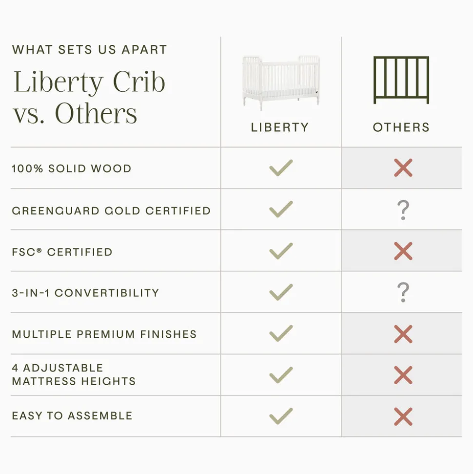 Made to treasure, Namesake brings quiet sophistication to the nursery and beyond. Imbuing heirloom-quality craftsmanship with modern sensibility, these timeless essentials are made to be cherished for years to come. The Liberty 3-in-1 Convertible Spindle Crib with Toddler Bed Conversion Kit in Warm White brings a fresh, airy feel to the nursery with its refined finish and heritage-inspired silhouette. Sturdy construction and turned spindles lend a sense of enduring charm, while the included conversion kit ensures lasting versatility.