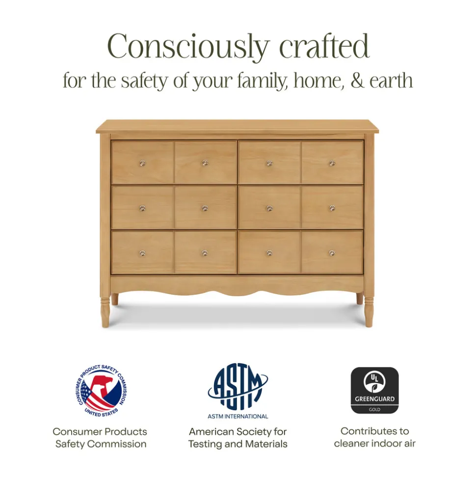 Crafted from sustainably sourced wood in a honey finish. Features six dovetail-joined drawers with self-closing ball-bearing glides and classic drawer pulls. Designed to coordinate with the Liberty, Abigail, and Winston cribs. Arrives fully assembled. GREENGUARD Gold Certified.