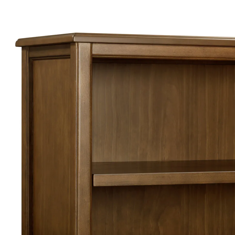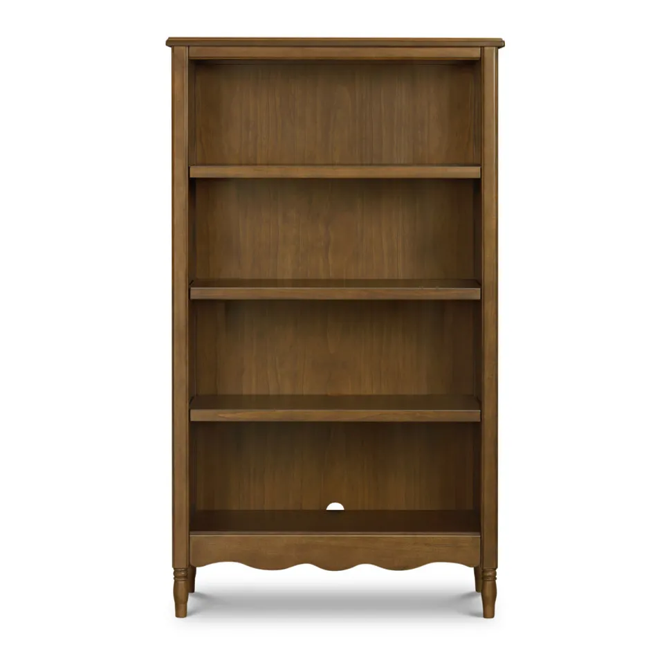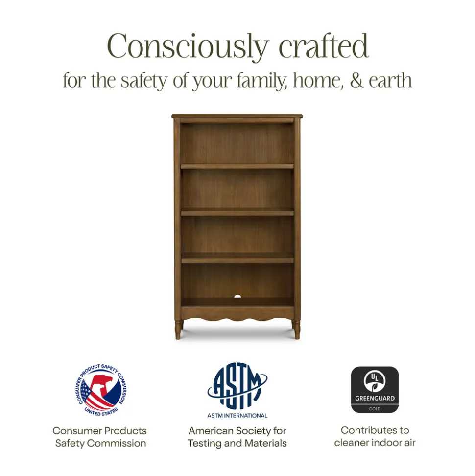 Crafted from sustainably sourced wood with a natural walnut finish. Features four fixed open shelves and molded trim detailing. Coordinates with the Liberty, Abigail, and Winston collections. Arrives fully assembled. GREENGUARD Gold Certified.