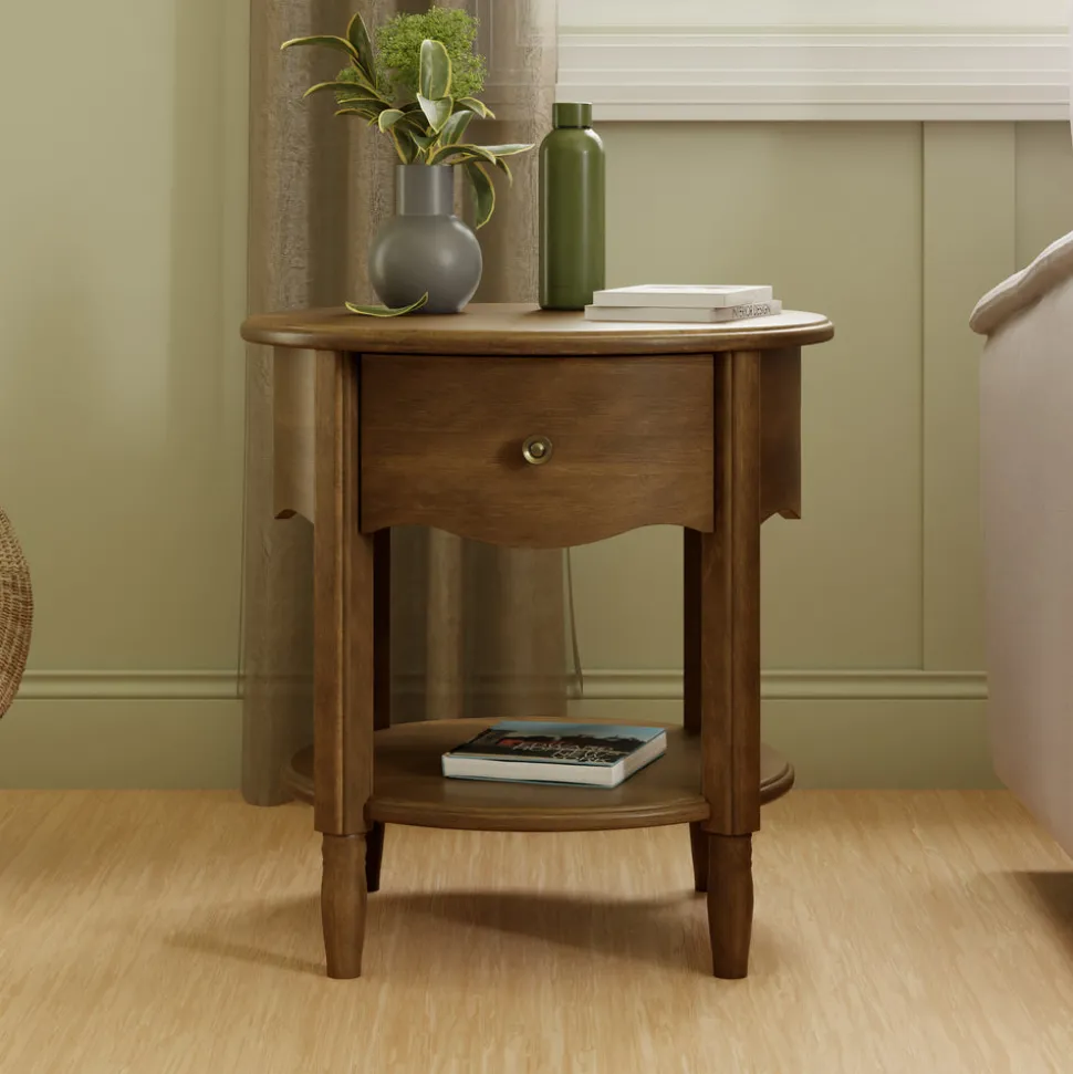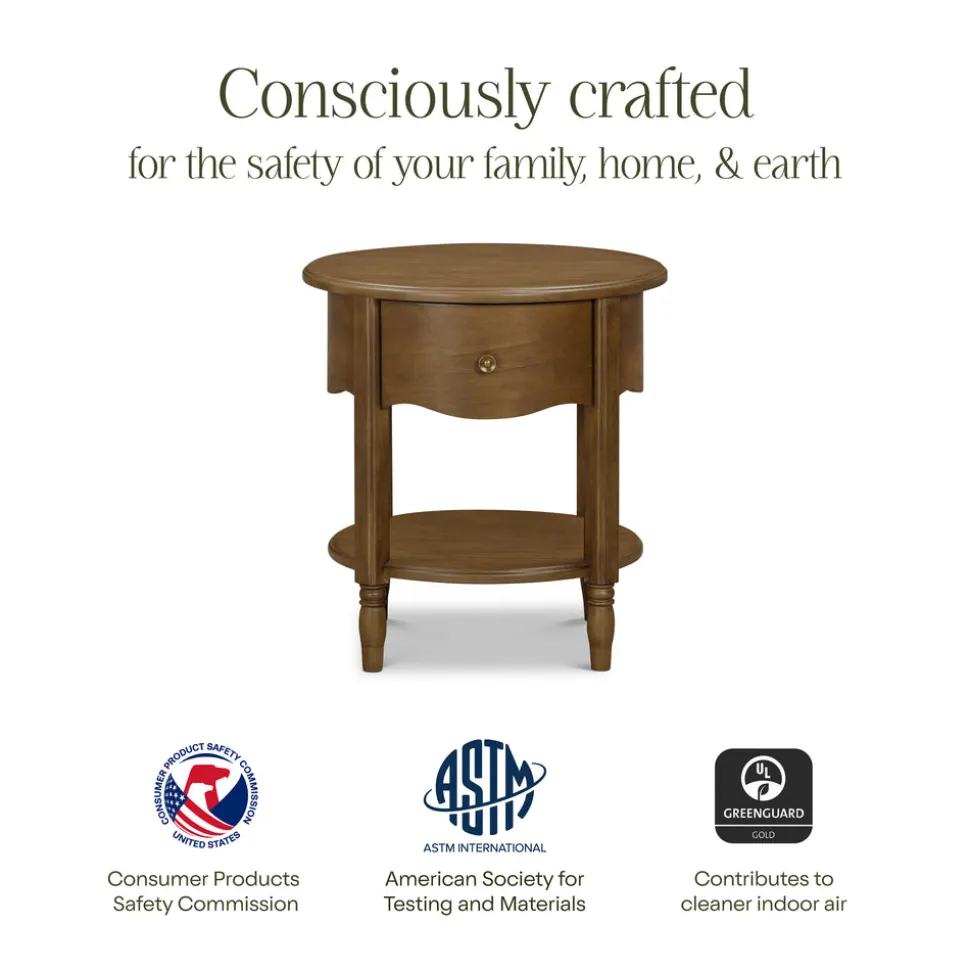 Crafted from sustainably sourced wood with a natural walnut finish. Features one soft-close drawer with metal hardware and an open lower shelf. Scalloped apron and tapered feet for a timeless look. Arrives fully assembled. GREENGUARD Gold Certified.